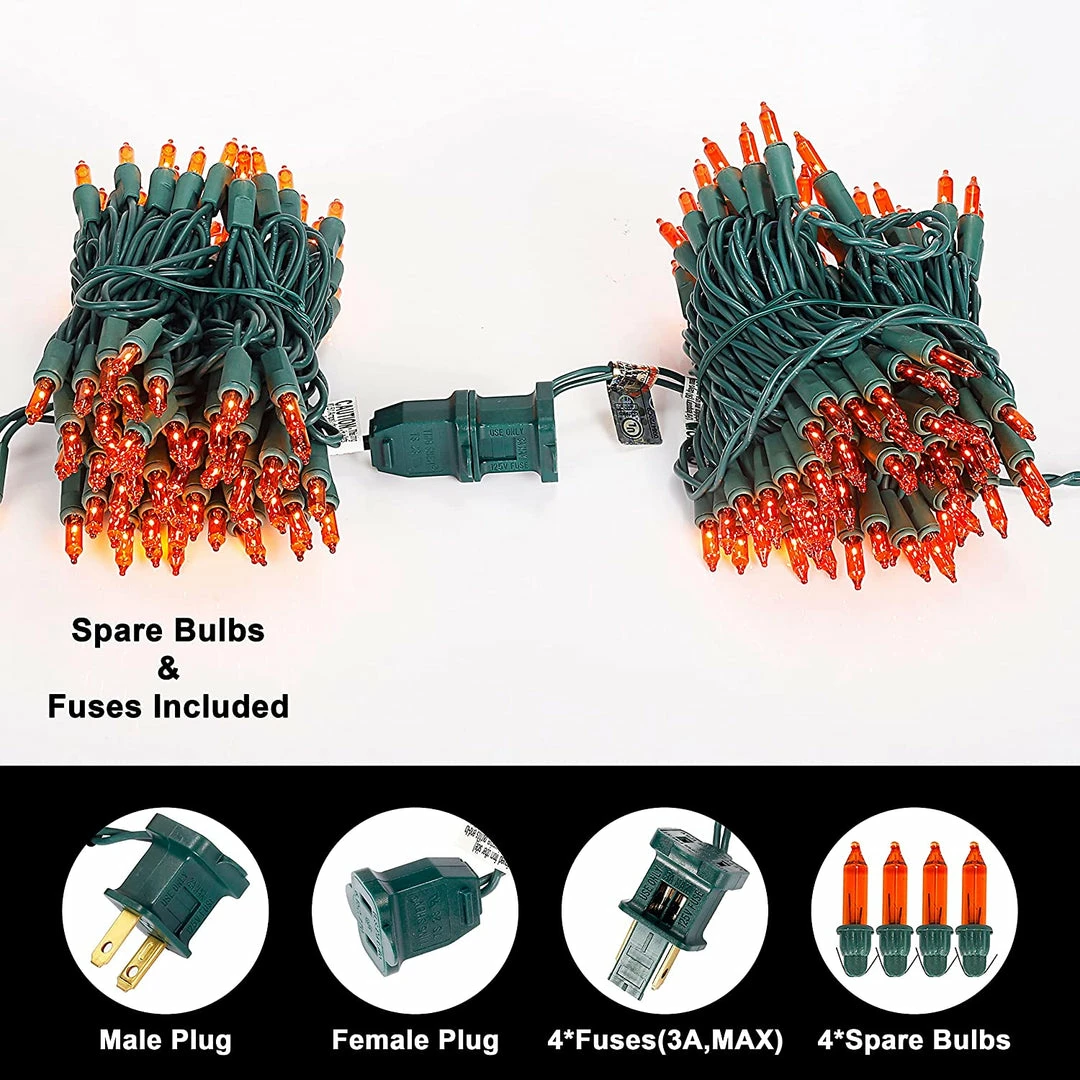 - Our Halloween string lights include 3 sets of string lights that contain 100 count orange incandescent lights that are waterproof with a total length of 22.3 ft, you can connect them end to end 5 sets.