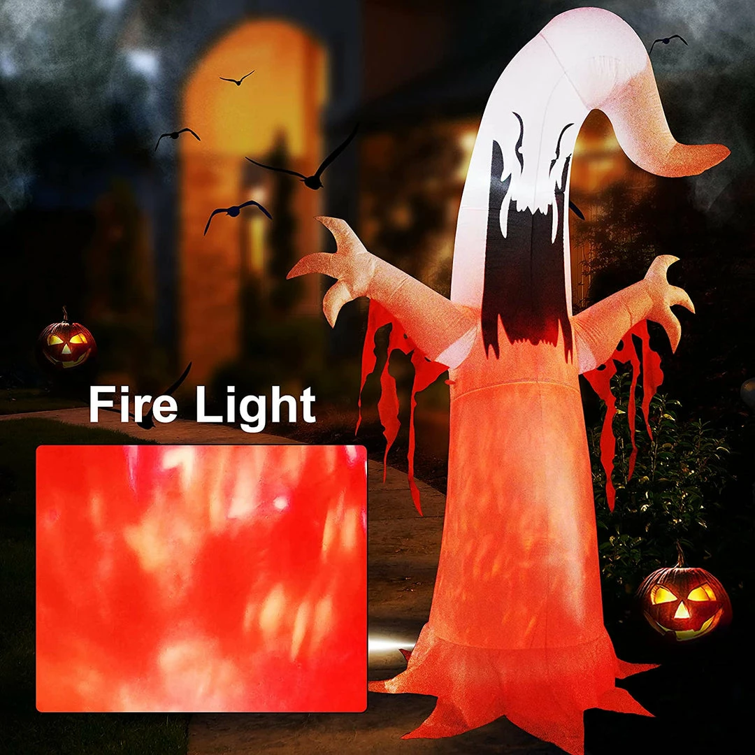 - 12 feet tall scary ghost inflatable with firelight and flaming shreds comes with extended cords, ground stakes, fastened ropes, built-in sandbags, and a plug with ul certification.