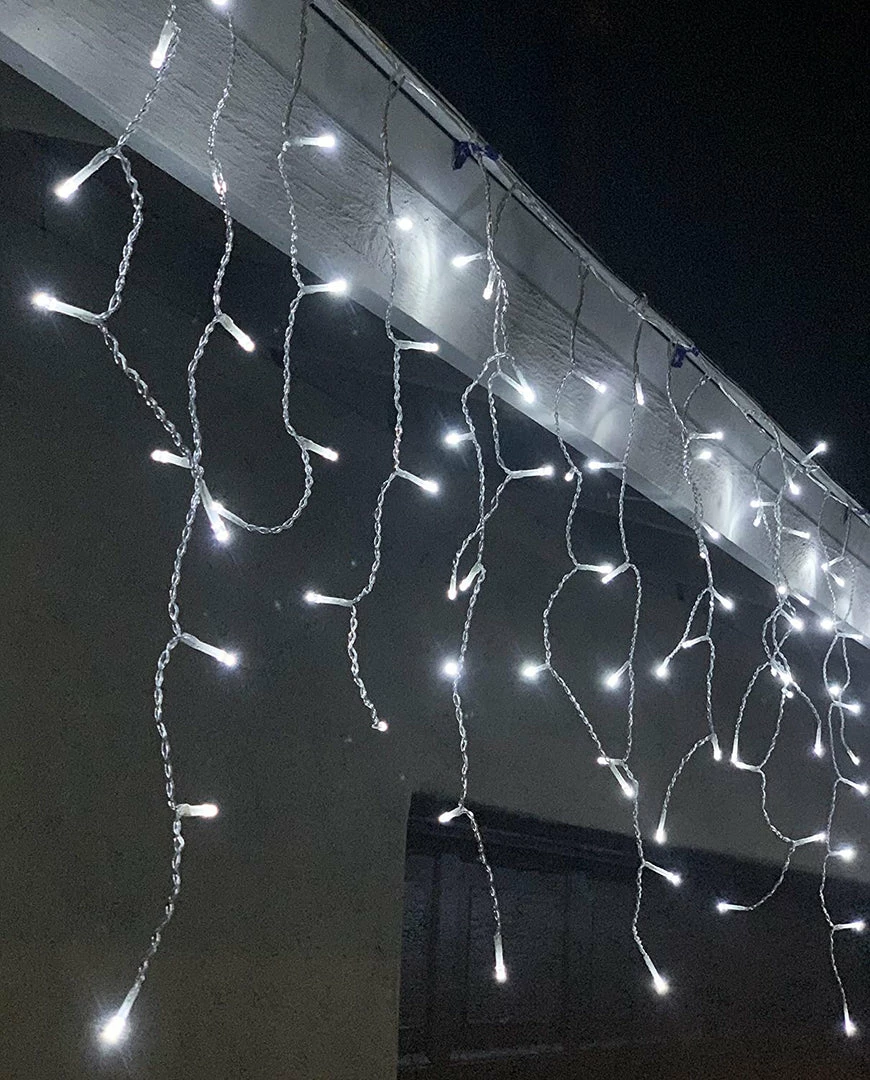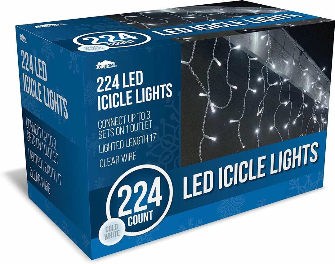 - SUPER VALUE. Joiedomi LED Icicle Christmas Lights has 224 bright Cold White LED bulbs with clear wire and can connect to up to 3 sets on 1 outlet. Lighted length of 17 Feet. Features 8 lighting modes. Low Voltage.