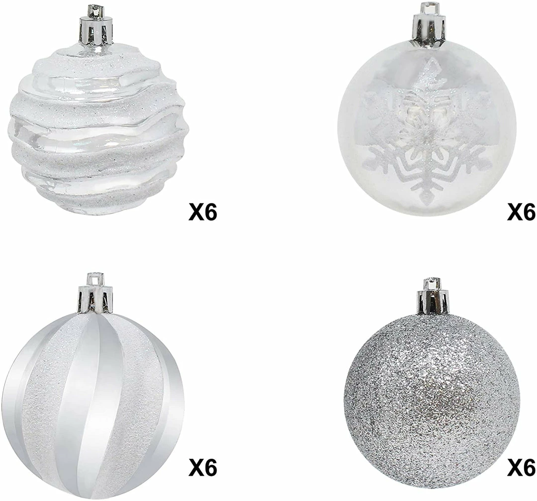 - SUPER VALUE PACK. Our Christmas Tree Ball Ornaments Set includes 6 Wavy Stripes Balls, 6 Snowflake Balls, 6 Swirls Balls, 6 Glitter Balls.