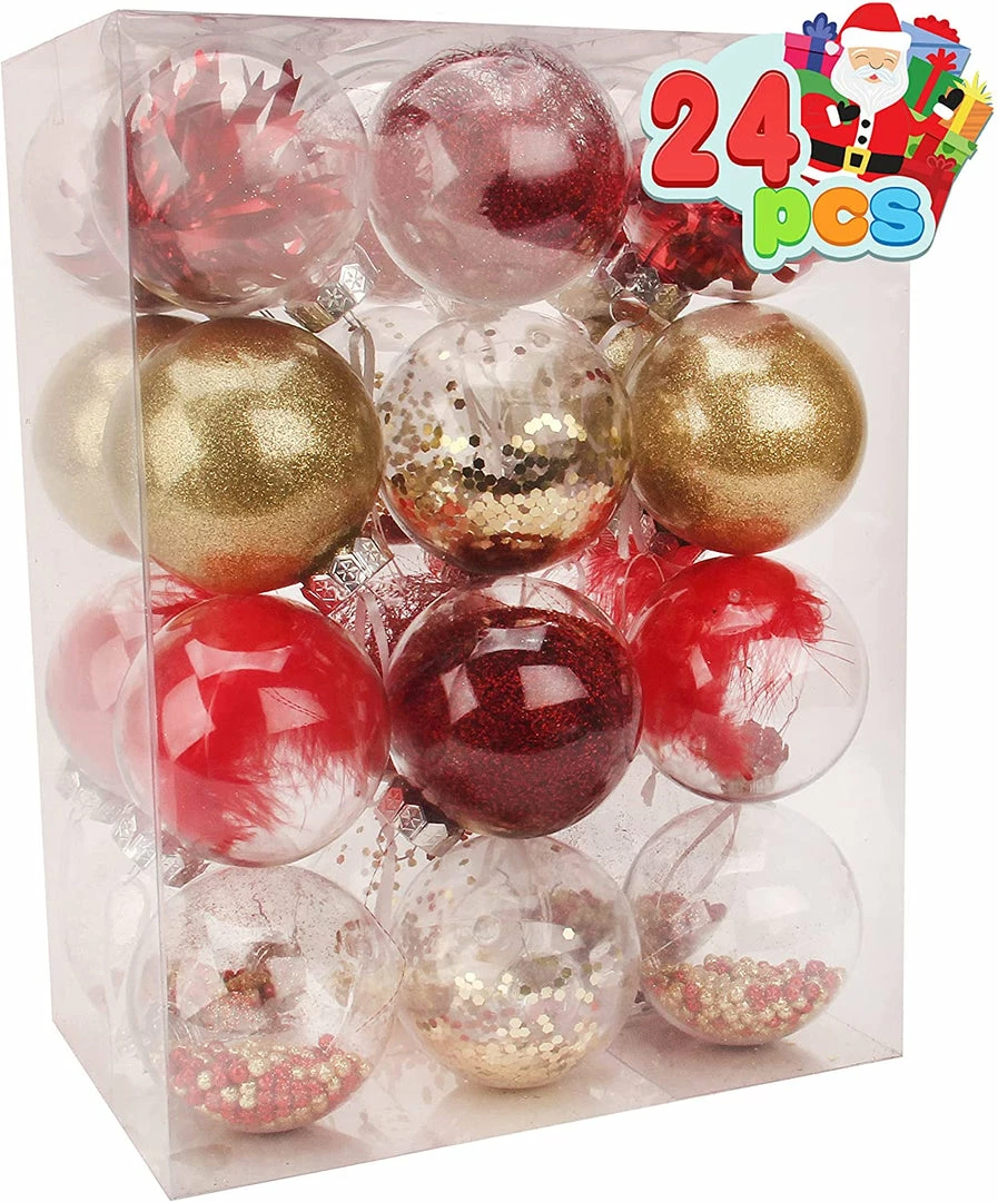 - Our fantastic Christmas decorations include 4 clear plastic balls with feathers, 4 clear plastic balls with metallic yarn, 4 clear plastic balls with shiny tinsel, 4 clear plastic balls with sequins, 4 clear plastic balls with particles, 4 clear plastic balls with glitter. Each color is bright and beautiful and perfect for Christmas indoor and outdoor decorations!
