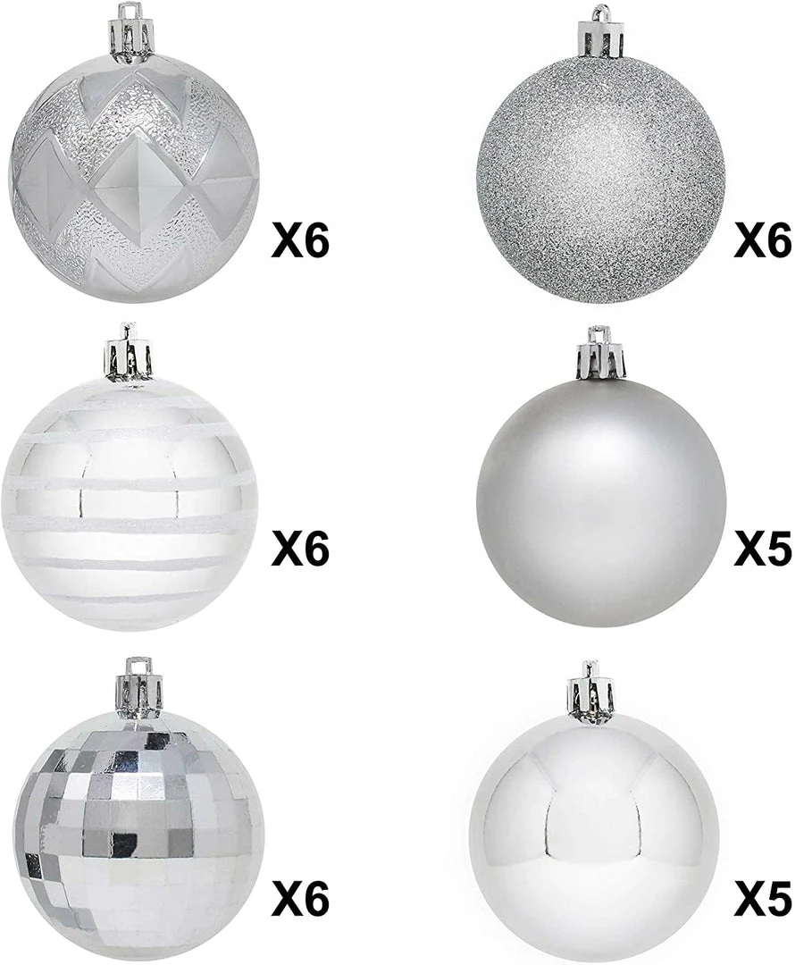 - SUPER VALUE PACK. Our Christmas Tree Ball Ornaments Set includes 6 Quilted Balls, 6 Stripes Balls, 6 Disco Balls, 6 Glitter Balls, 5 Matte Balls, 5 Shiny Balls.