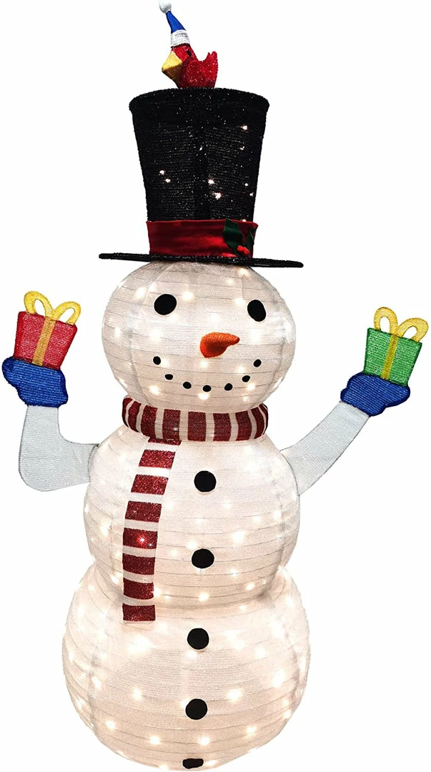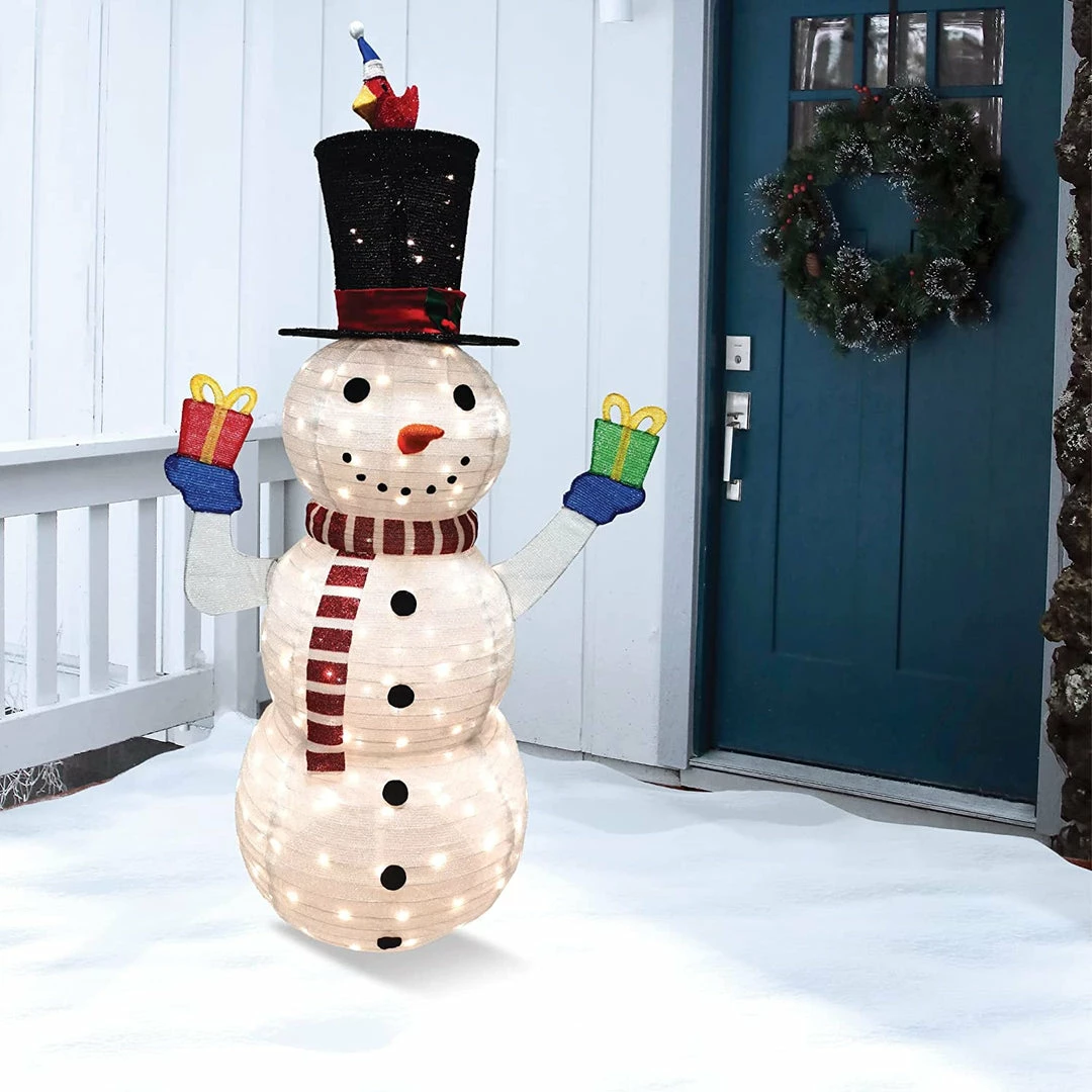 - Our snowman yard light includes a 5 feet tall collapsible snowman with 160 led warm white lights in clear wire, metal stakes, and zip ties. Made of tinsel material.