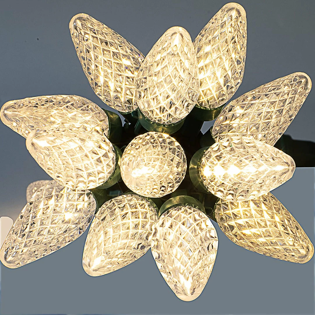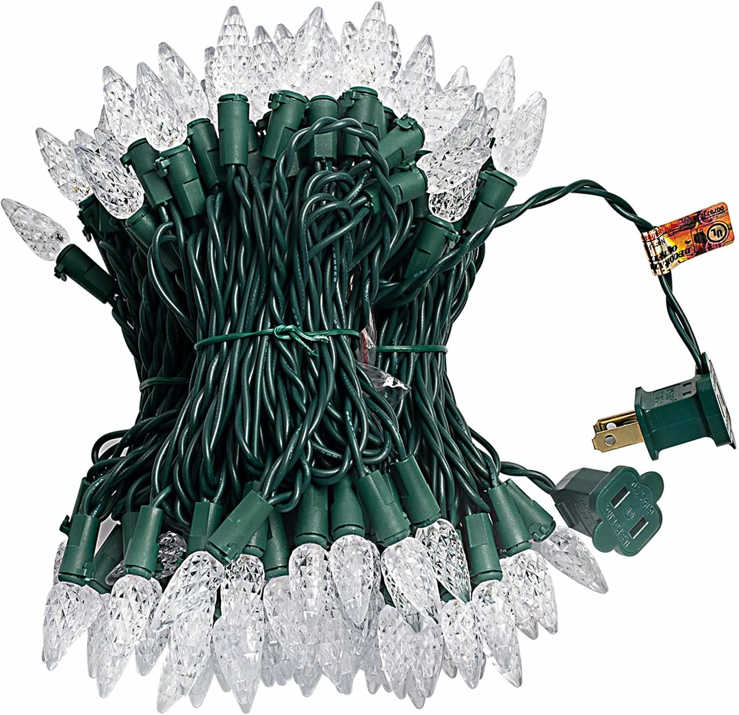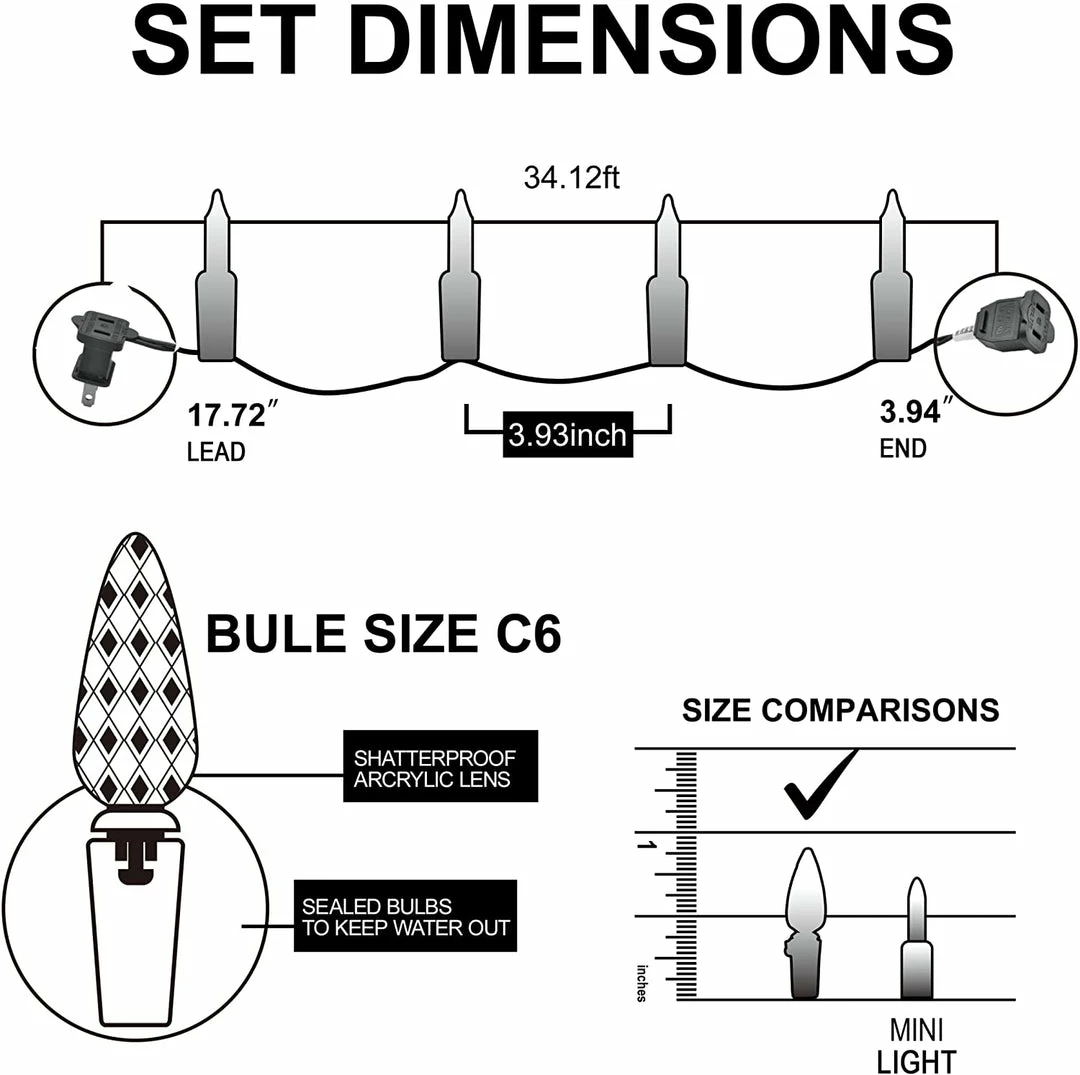 - Our Christmas lights set includes 1 pack of 150 count warm led light strings. It measures around 50.52 ft with green wire. Whole lighted length coverage of 48.72 ft. Also equipped with a c6 bulb type for more efficient, bright, and energy-saving lighting. Our package provides 1 extra c6 bulb count for replacement.