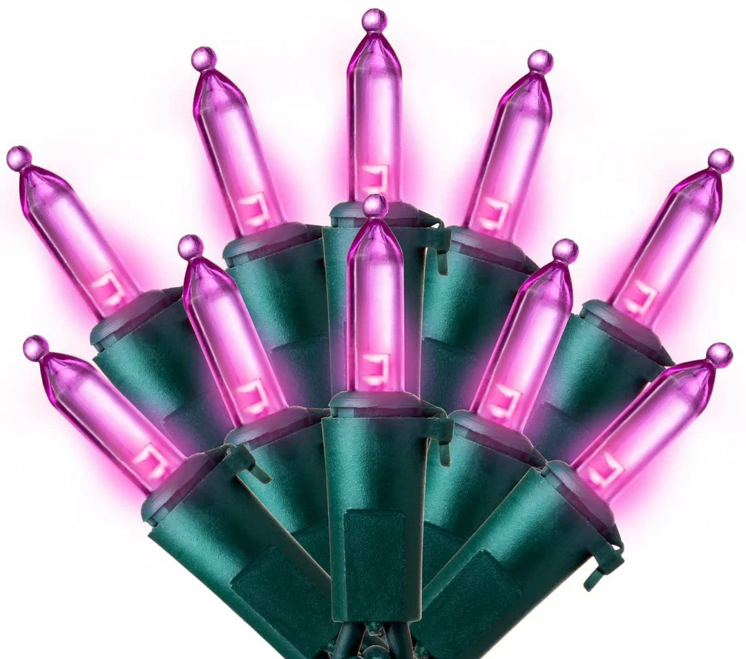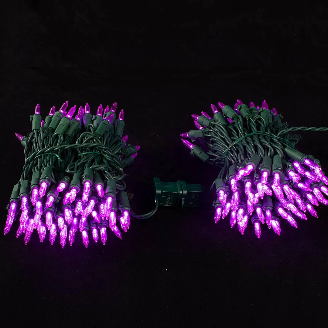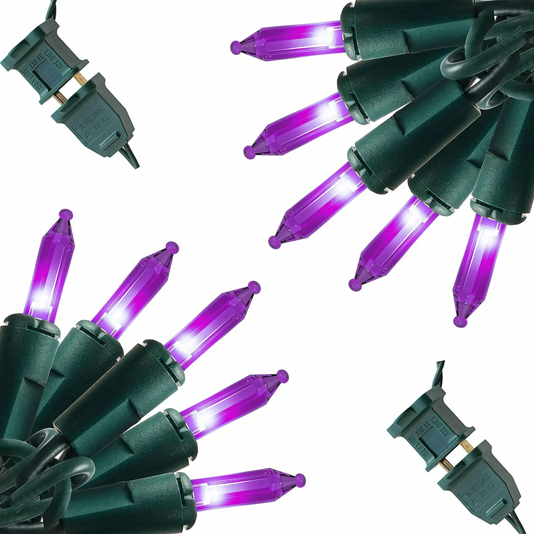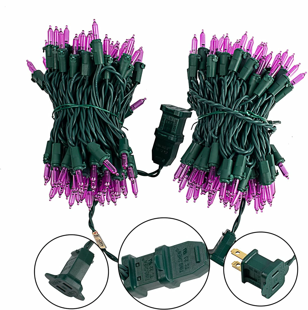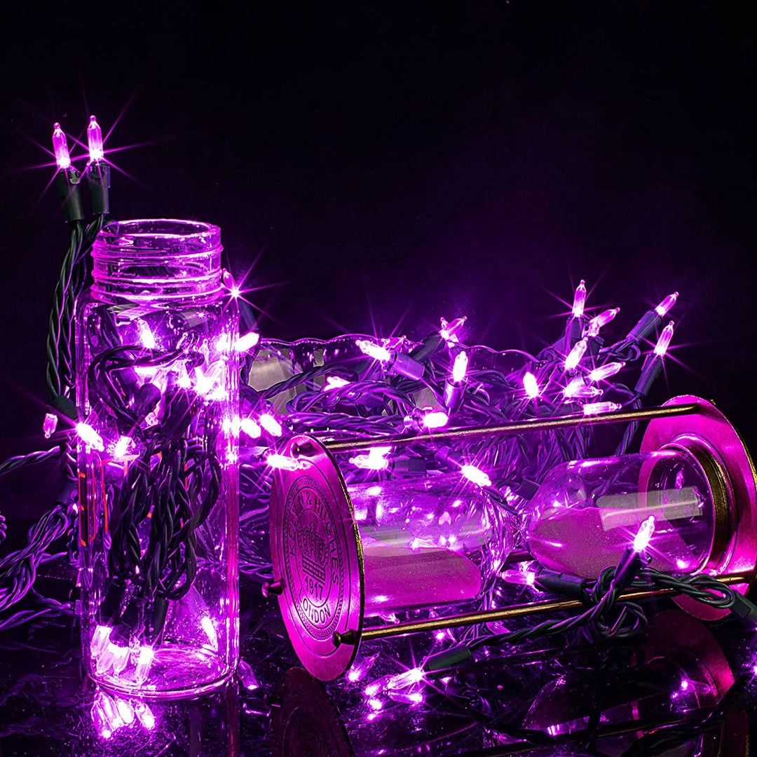 - Our Christmas lights set includes 2 sets of 100 counts of always-on holiday purple led string lights. Each set lighted 26.25 feet in length and 100 count super bright purple LEDs.