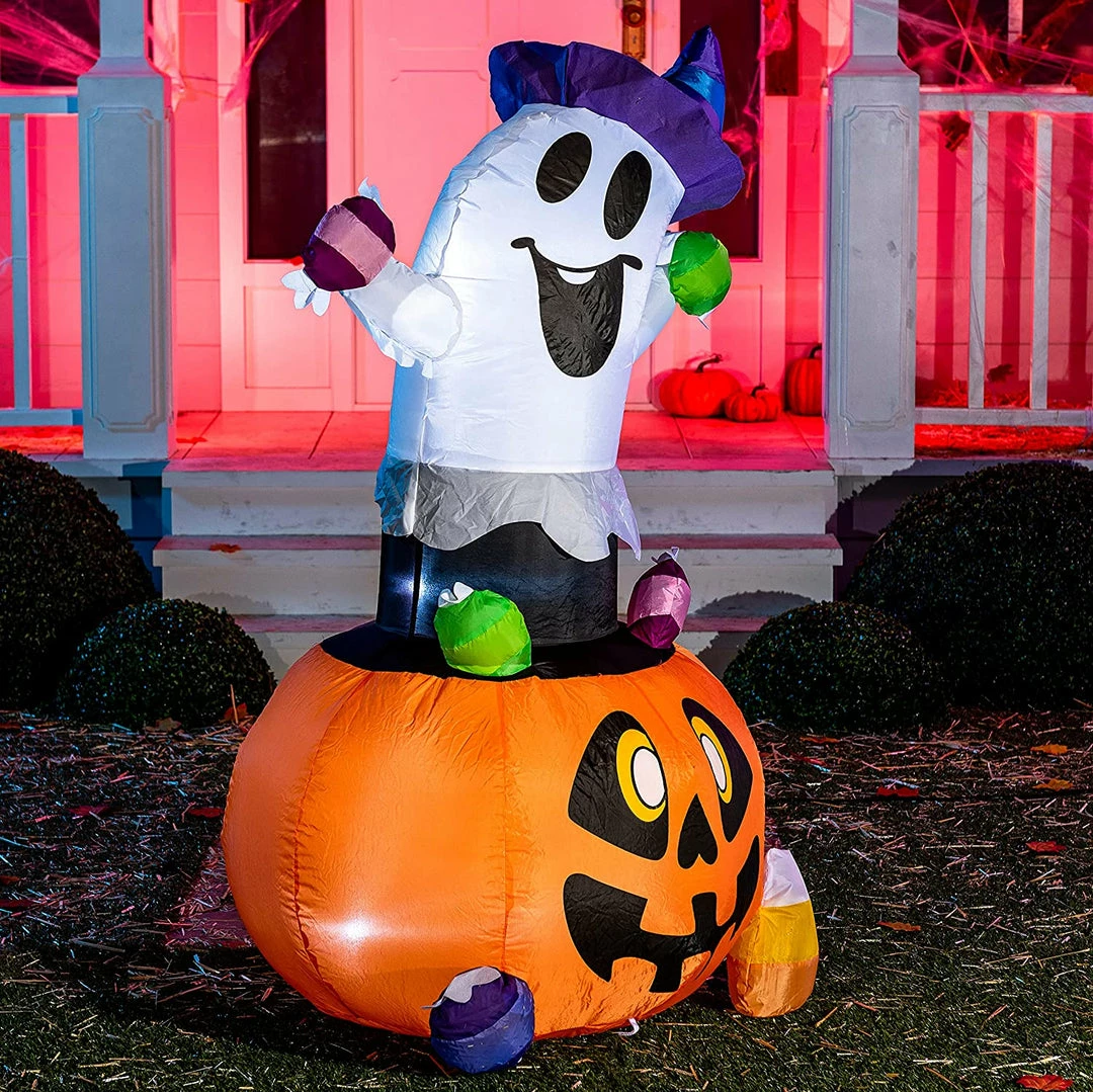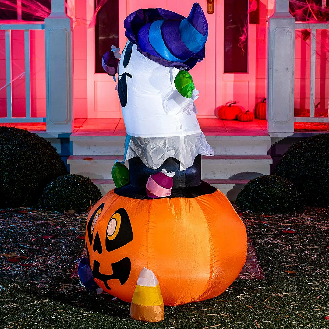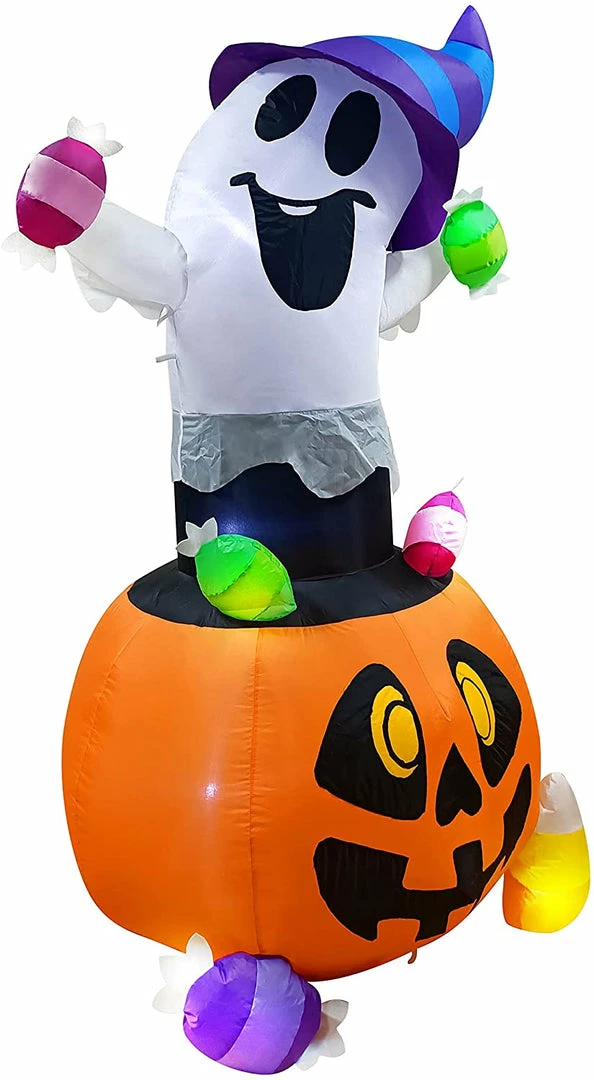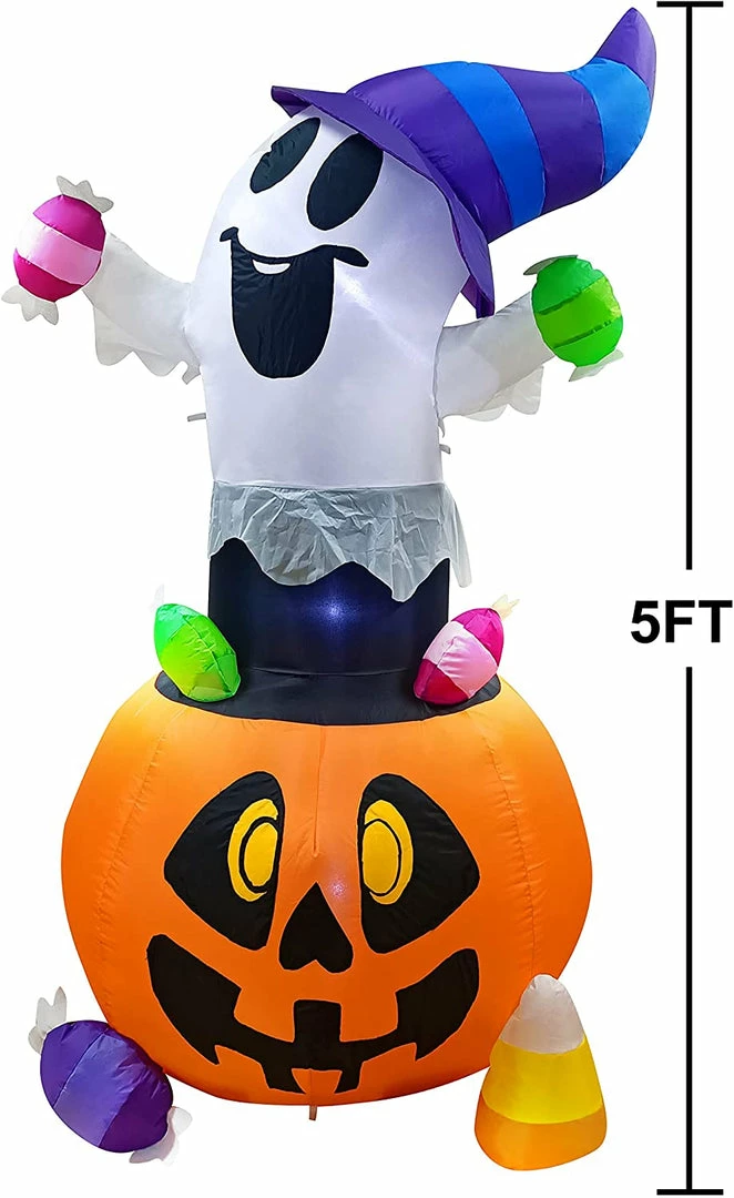 - 5ft tall cute gripping candy Halloween inflatable ghost comes with extended cords, ground stakes, fastened ropes, built-in sandbags, and a plug withΒ UL certification.