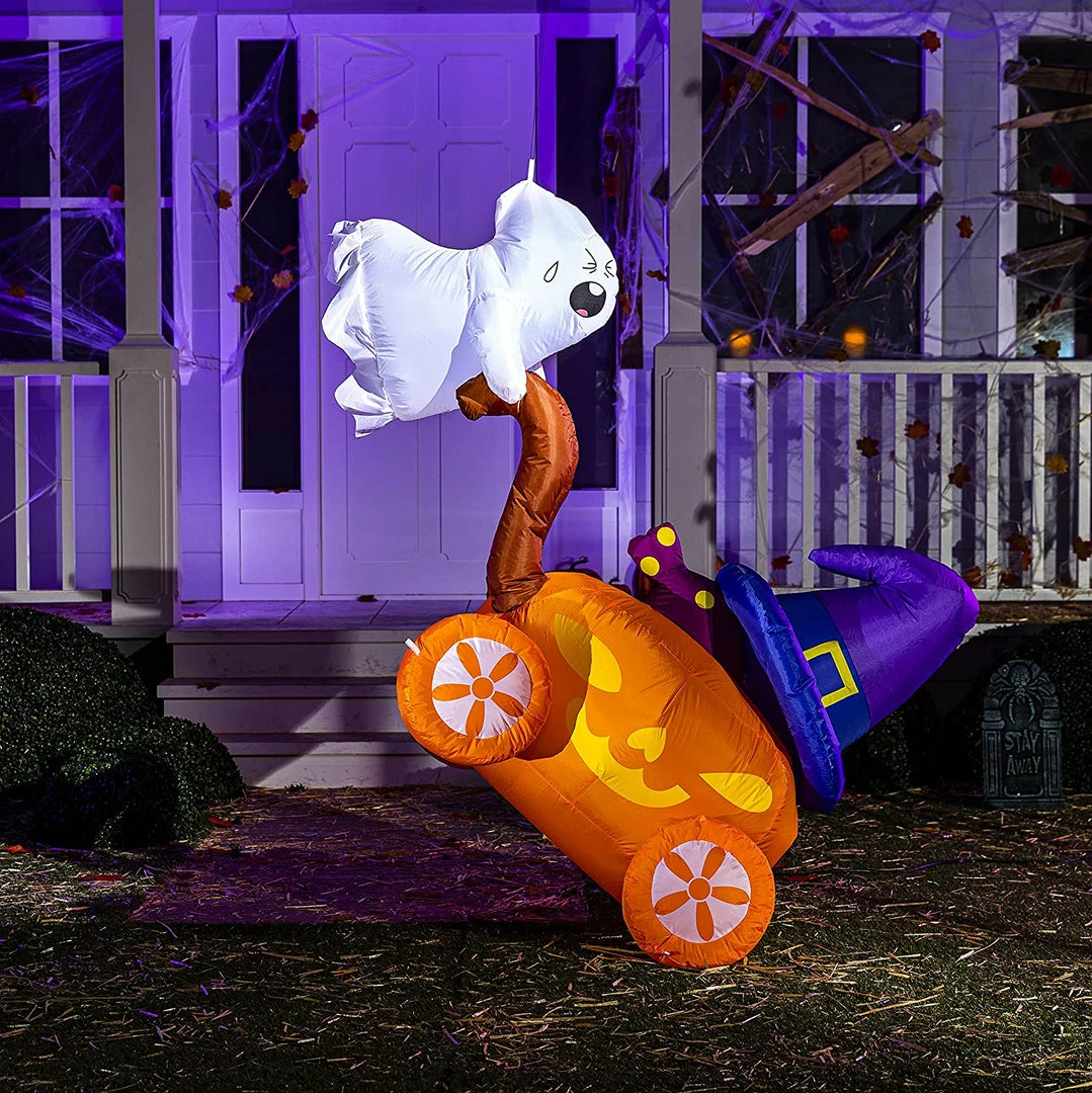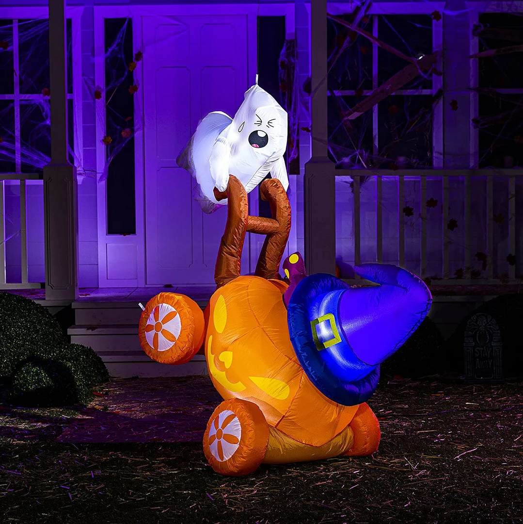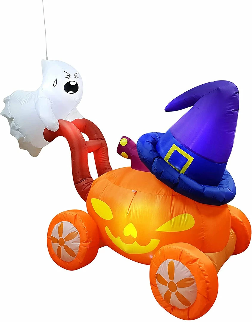 - 5 feet tall cute Long Halloween Pumpkin Carriage with Witch Hat with a Hanging Ghost pushes Pumpkin Carriage comes with extended cords, fastened ropes, built-in sandbags, and a plug with UL certification.