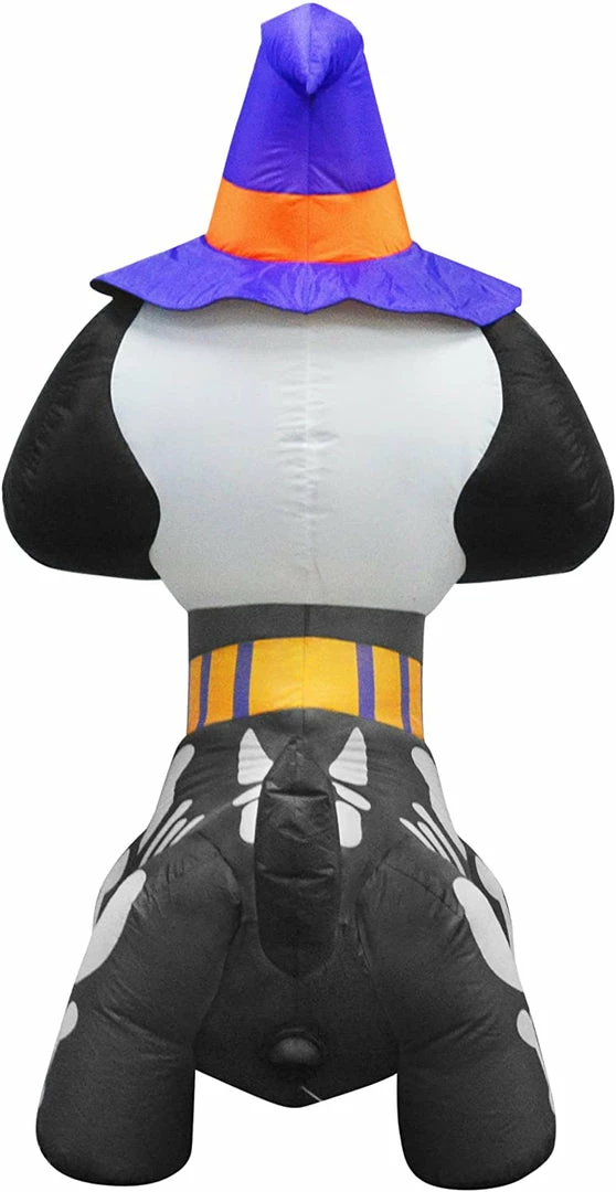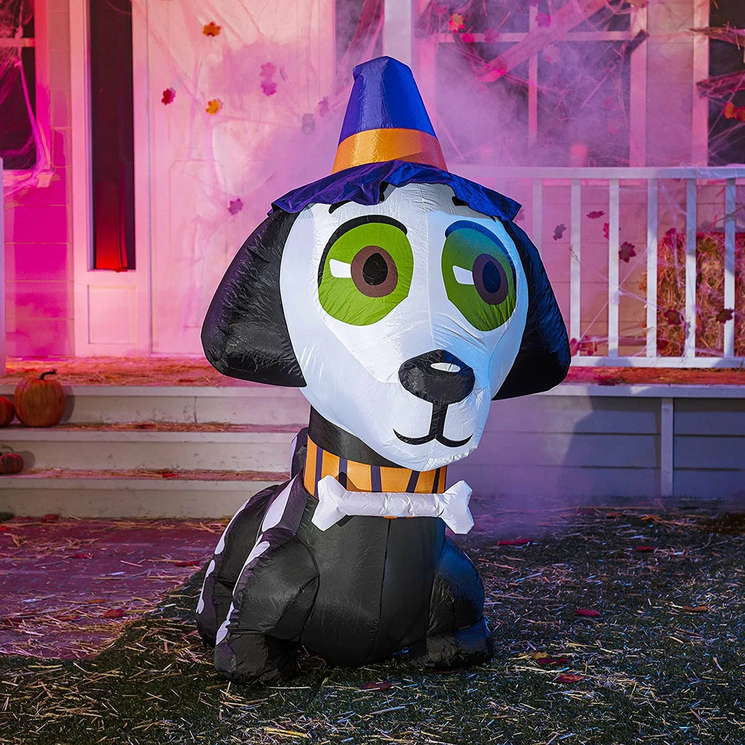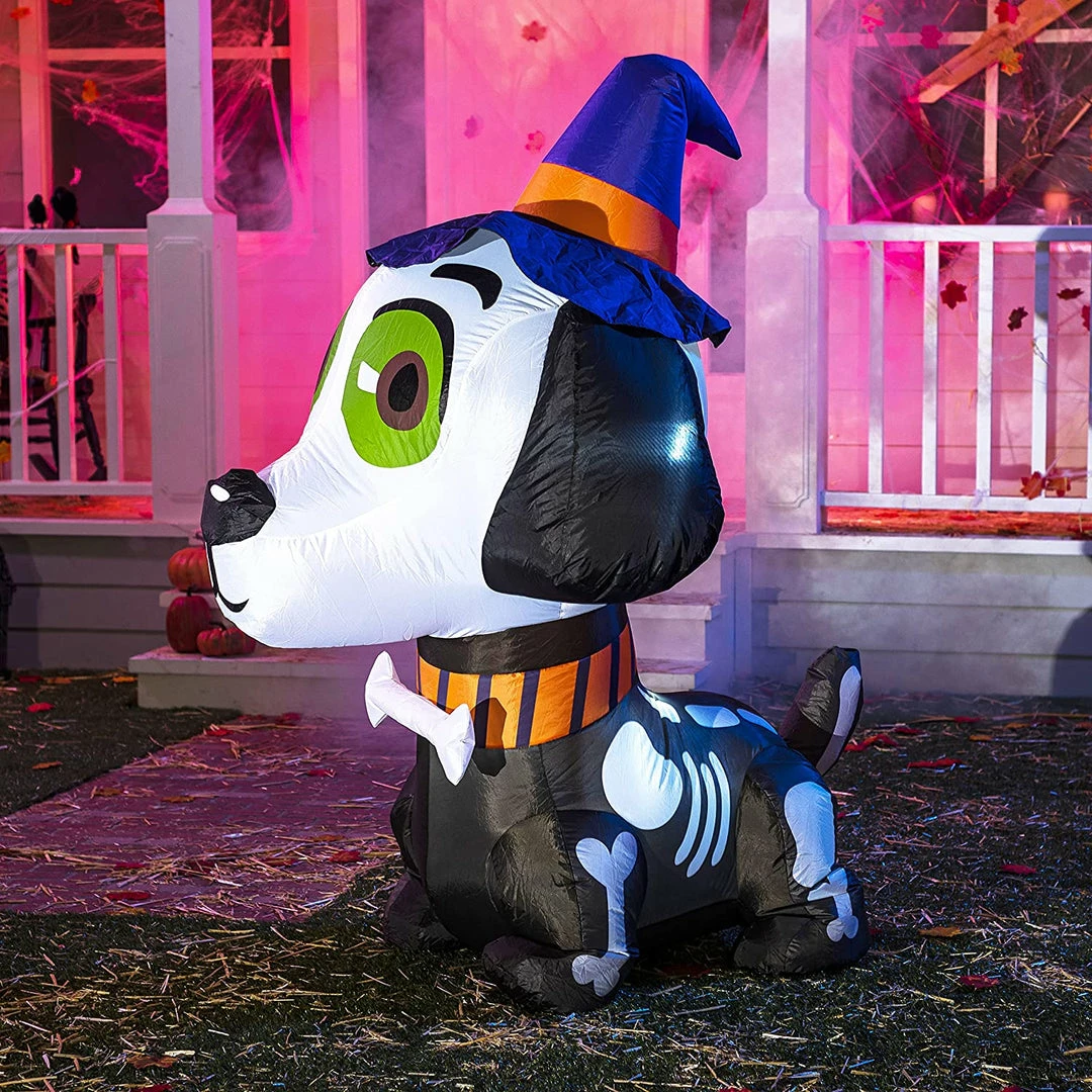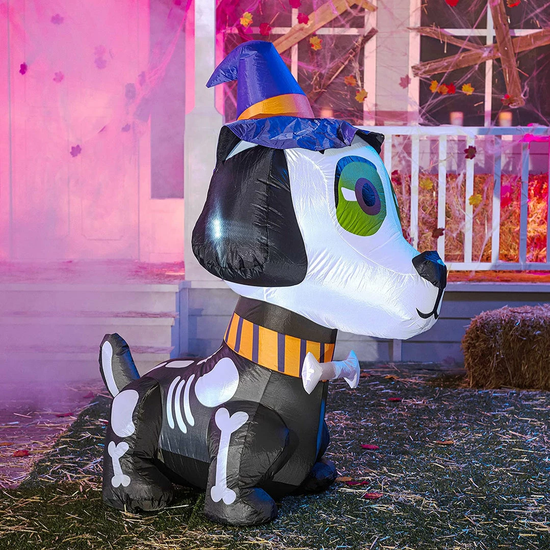 - 5 feet tall witch hat skeleton dog inflatable comes with extended cords, ground stakes, fastened ropes, built-in sandbags, and a plug with UL certification.