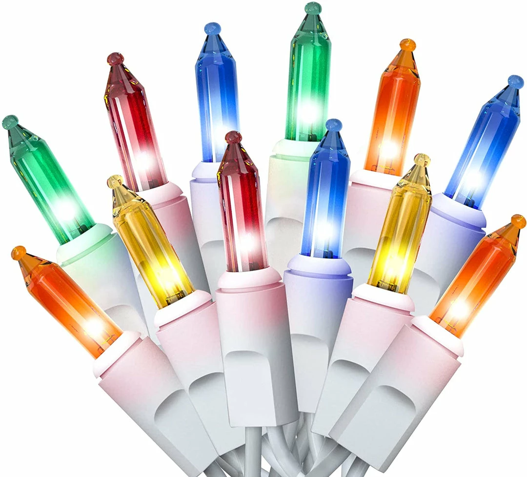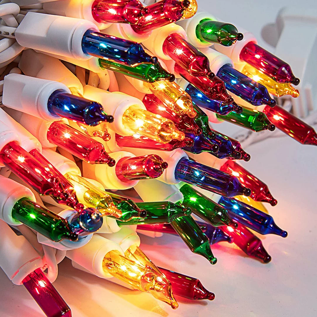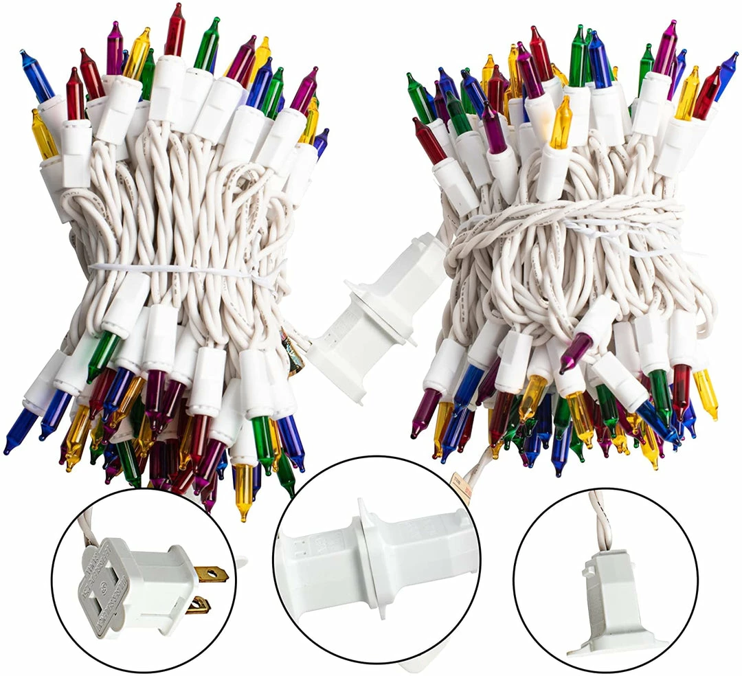 - Our multicolor string lights include 3 packs of 100 count clear white incandescent lights on white wire with 6 extra bulbs and 3 fuses. Each set measures 21.3 ft.