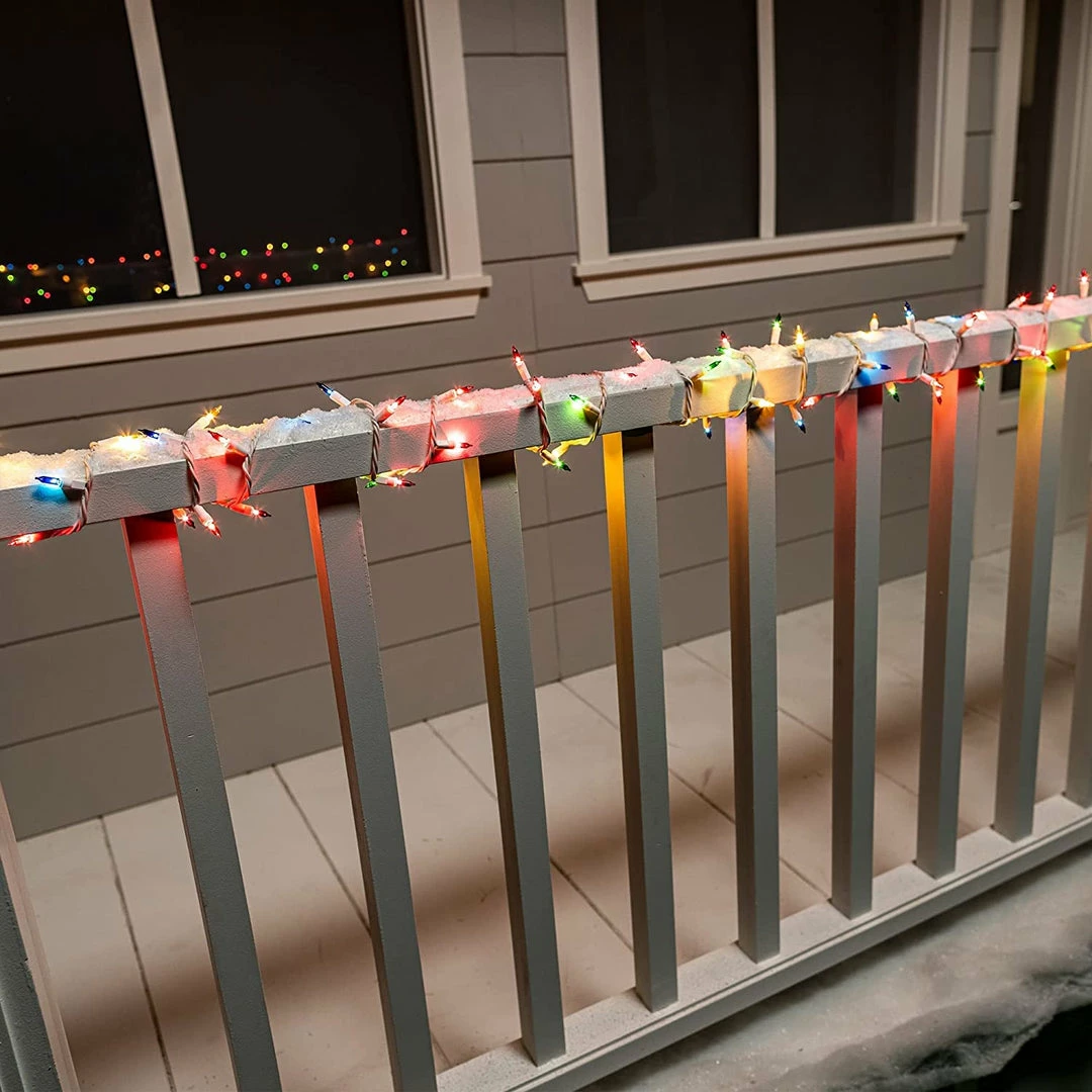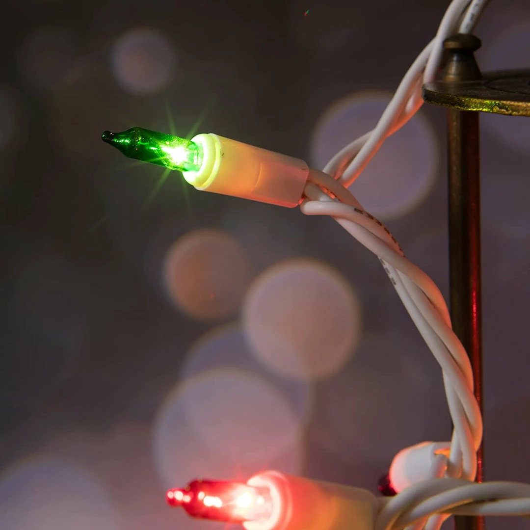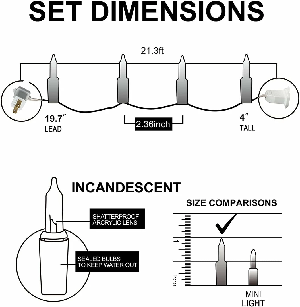 - Our multicolor string lights include 3 packs of 100 count clear white incandescent lights on white wire with 6 extra bulbs and 3 fuses. Each set measures 21.3 ft.