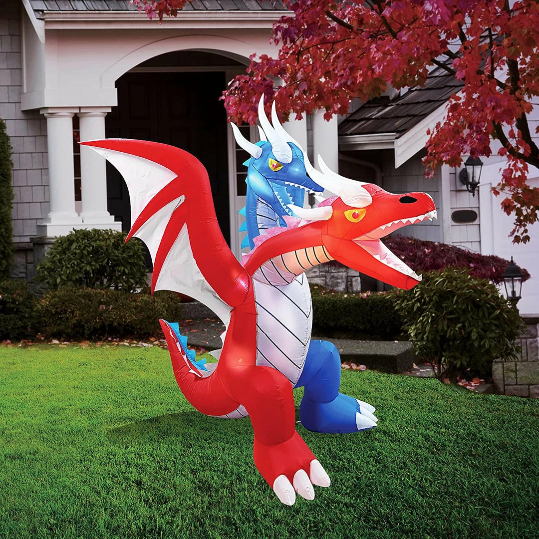 - 6 feet long massive double headed dragon halloween inflatable comes with extended cords, ground stakes, fastened ropes, built-in sandbags, and a plug with UL certification.