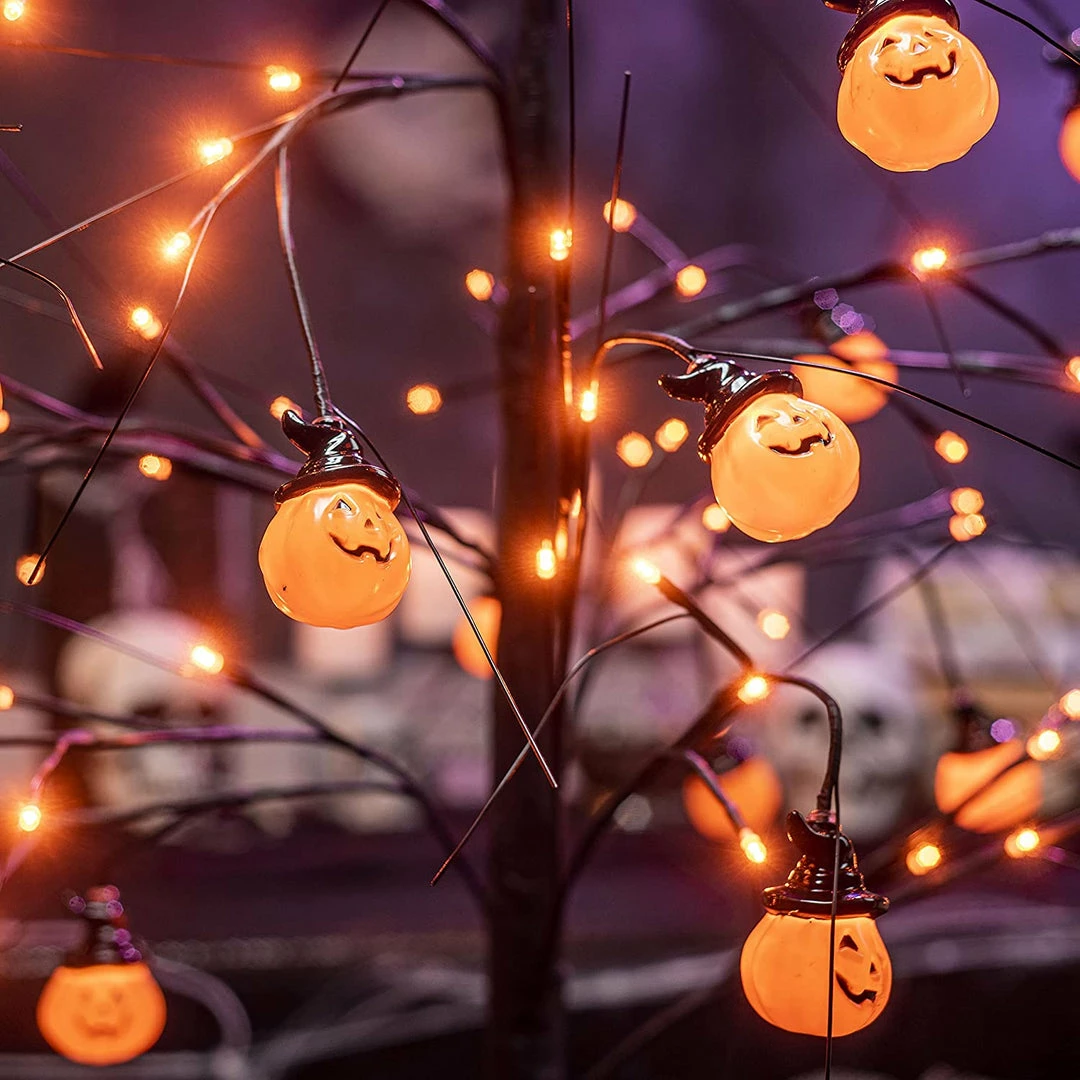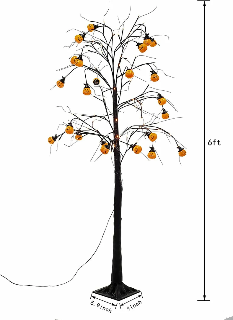 - Our Halloween dรฉcor includes our glittered tree with 48 orange led lights and 24 pumpkin Halloween decorations that measures 4 ft. Lighted artificial tree with 120v input power for safe use. Branches and trees may be bent into whatever form you choose. You can make a variety of shapes using our tools.