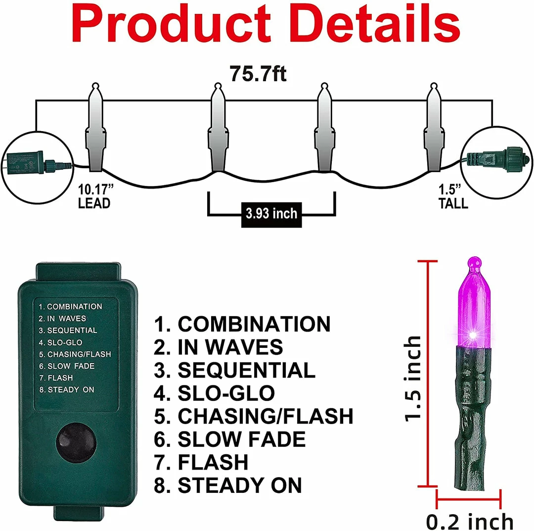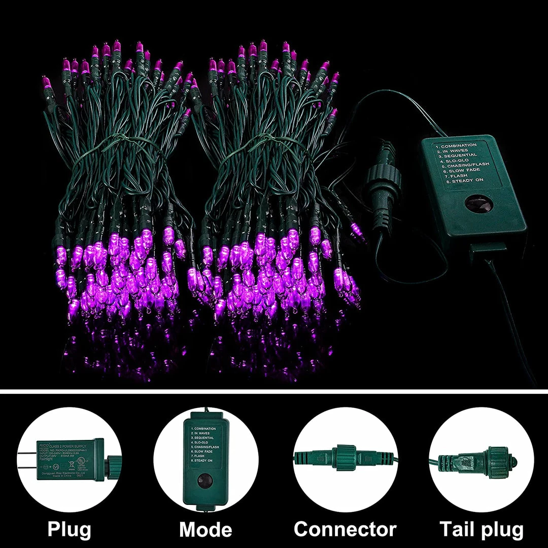 - GREAT HALLOWEEN DECORS: Our Halloween Lights include 200 Purple LED Green Wire String Lights with 8 Modes. Each set’s total length is 75.7 feet and 200 counts Purple LED has 3.93 inches spacing. The bulb’s height is 23mm.