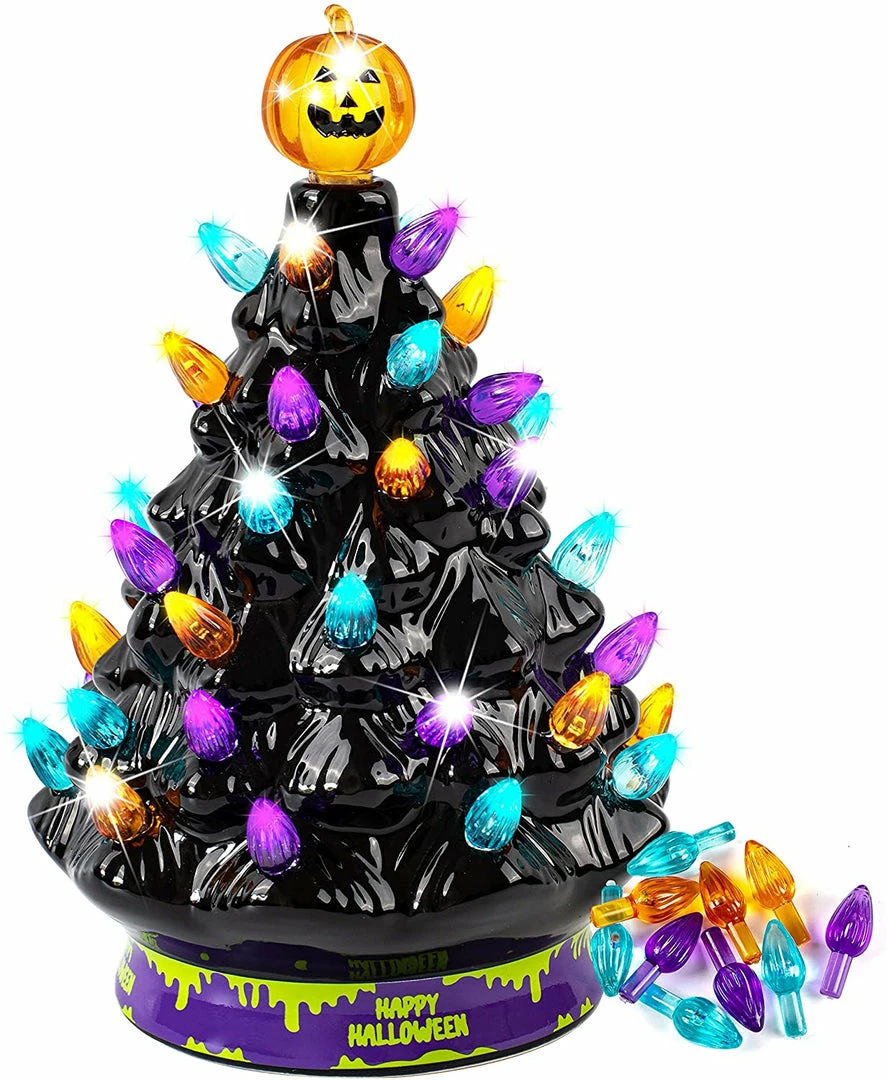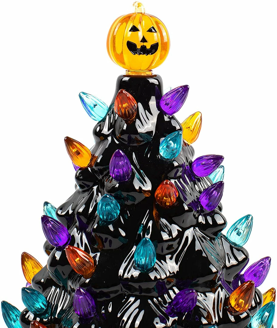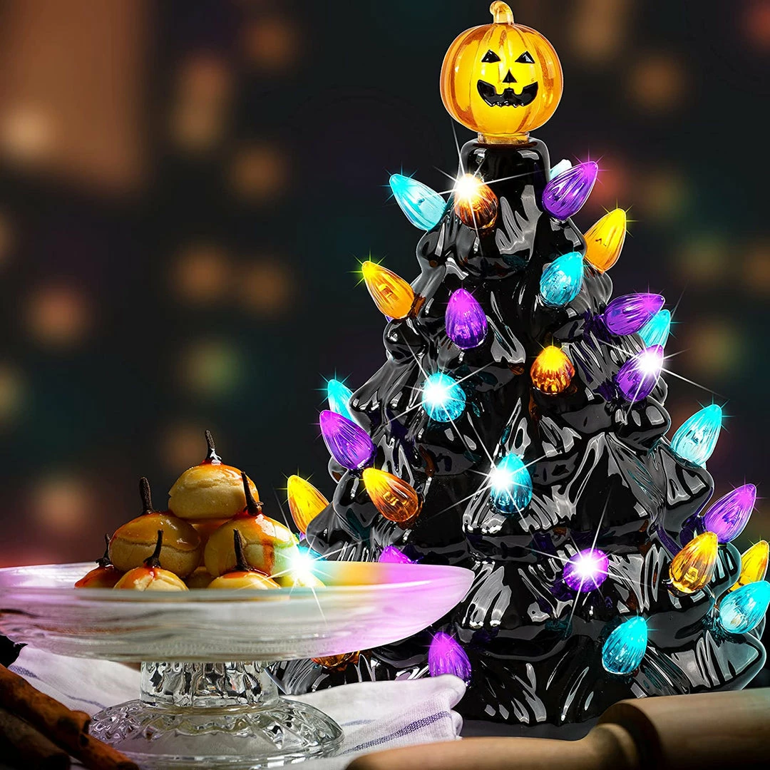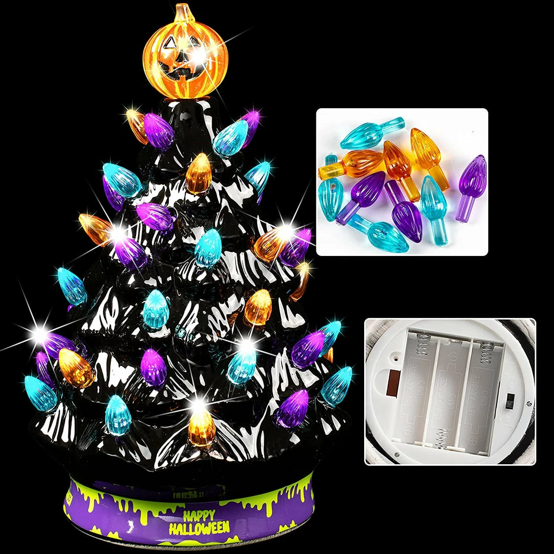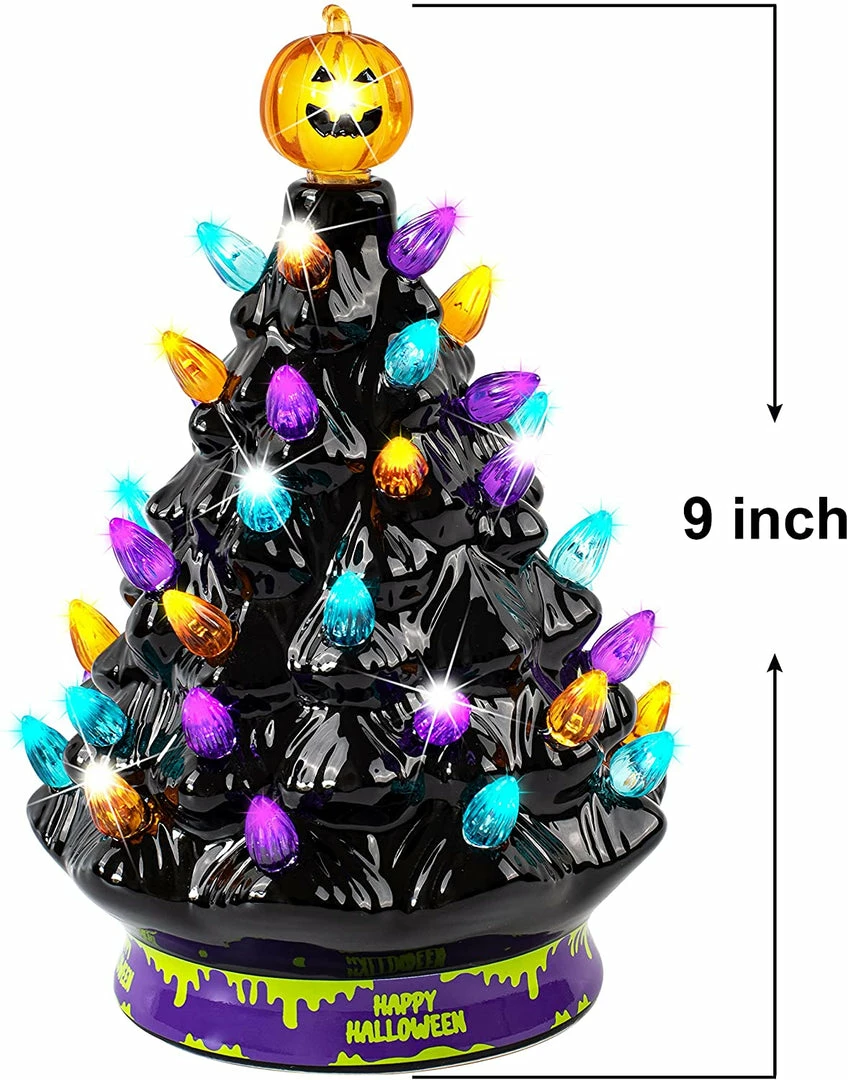 - Our mini Halloween-themed ceramic tree comes in 1 pc and it cutely stands at 9″. This is a pre-lit purple-colored and pumpkin head topper ceramic tree with a decorative beads design on it. It also provides 10 more replacement bulbs in the package.