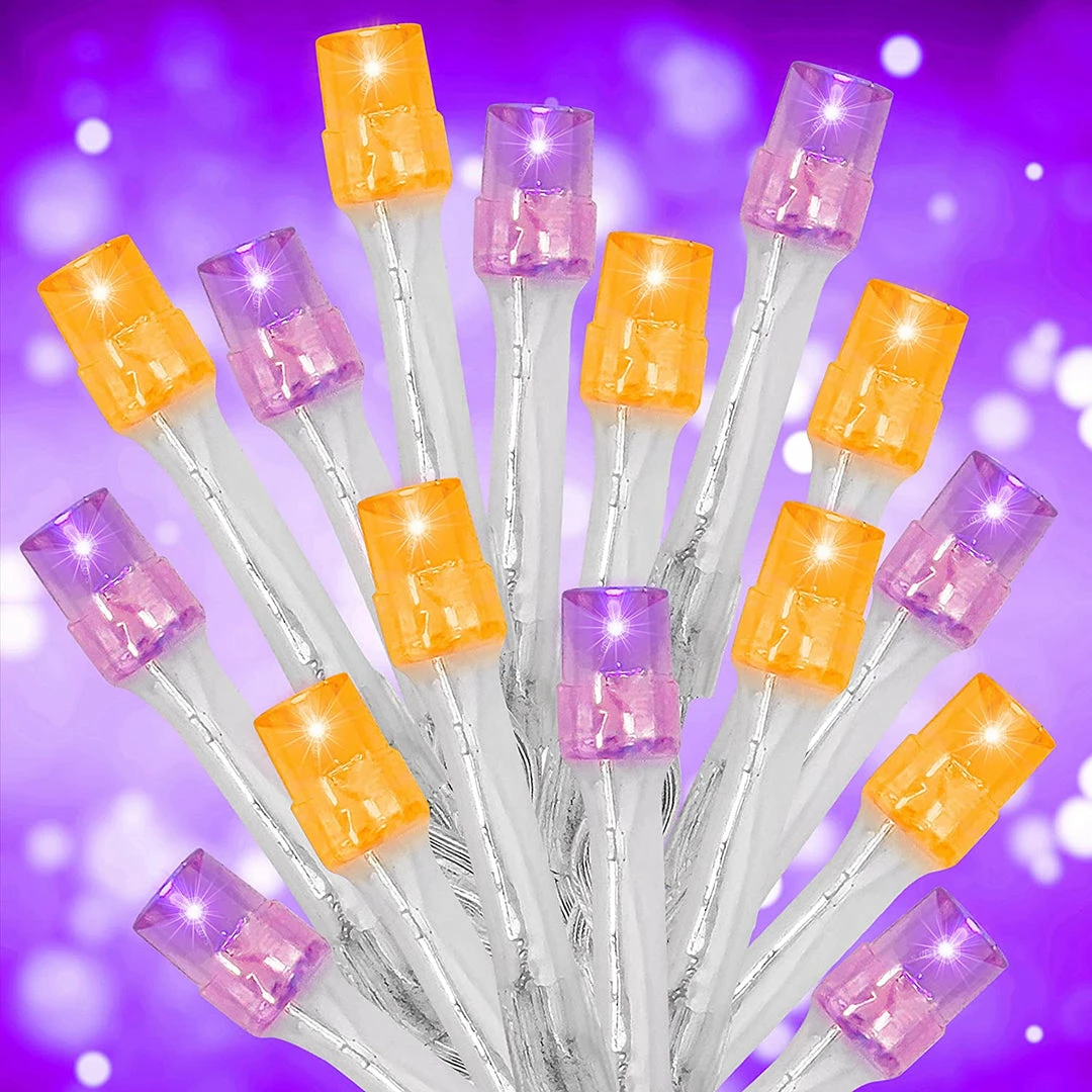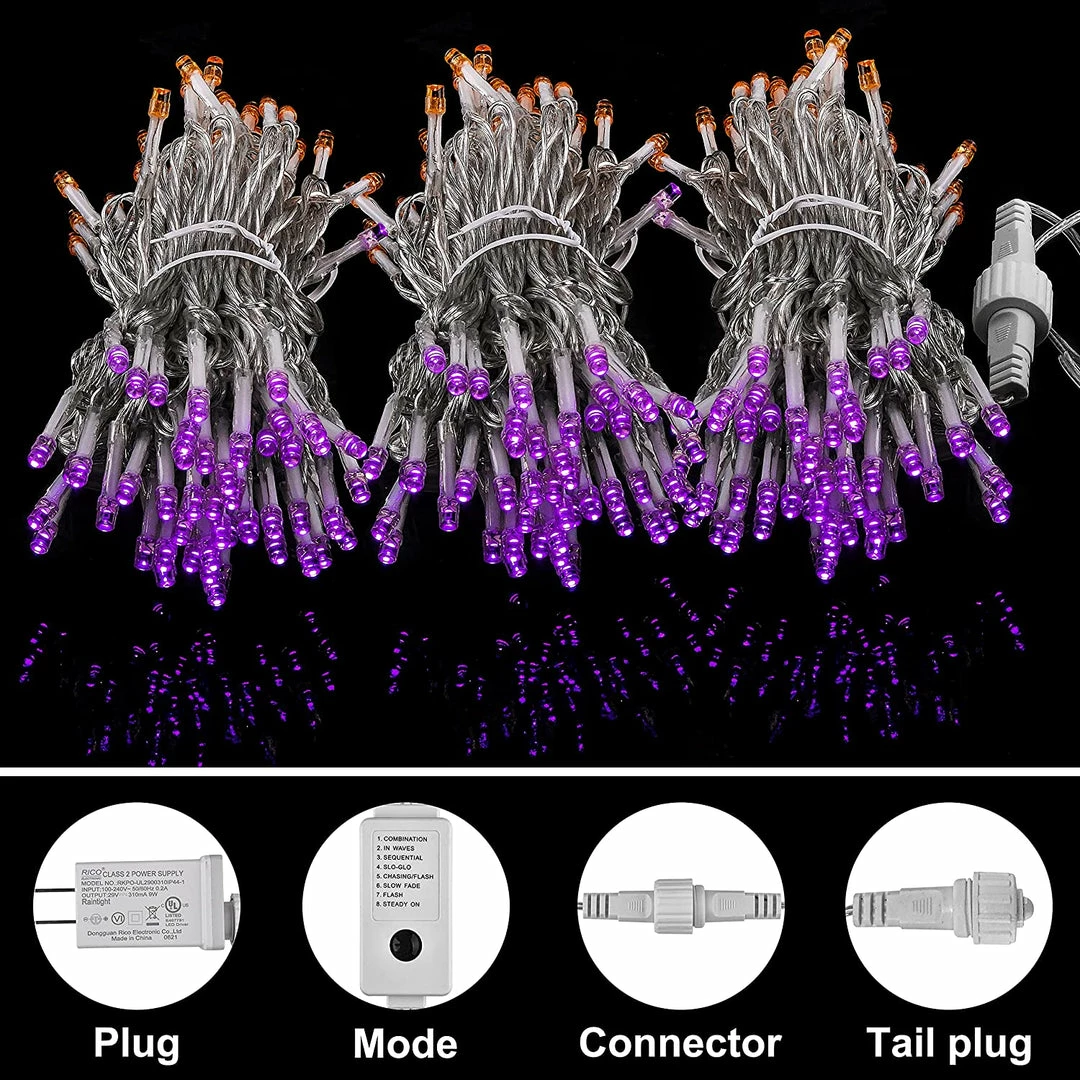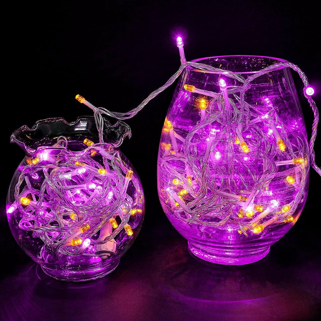 - Our Indoor Purple Lights Decor includes 300 Orange & Purple LED Clear Wire String Lights with 8 Modes. 300 Orange & Purple LED lights, powered by an adaptor. Widely used to hanging Christmas trees and toys. 29V low voltage string lights for safety use.
