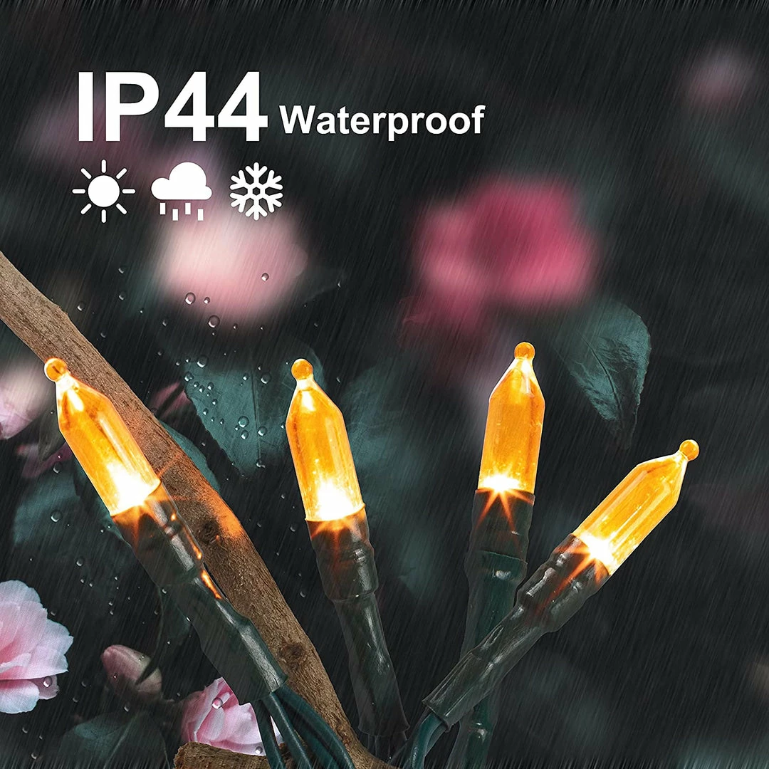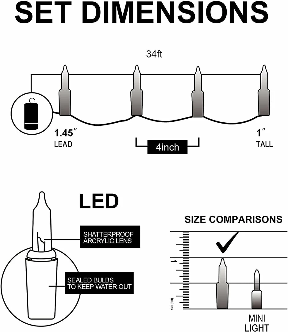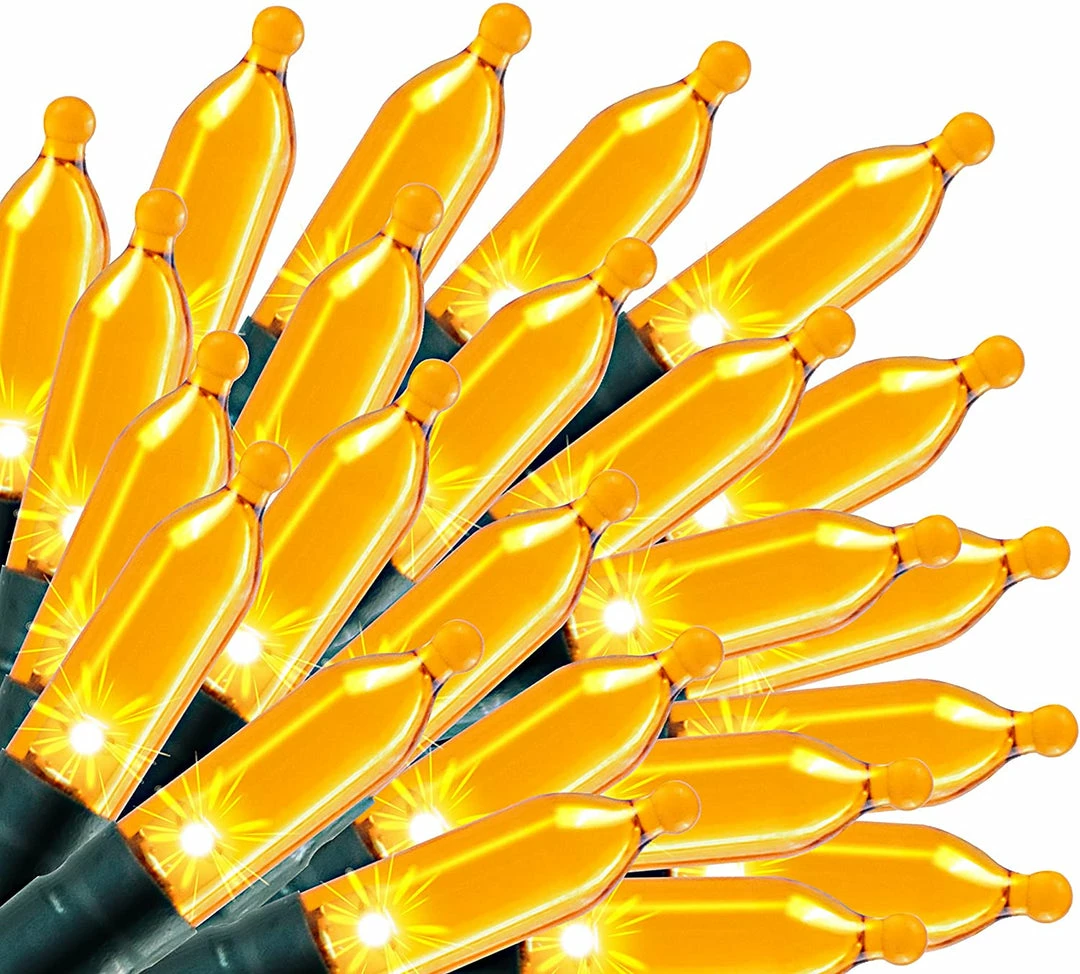 - SUPER VALUE. Our holiday lights set is composed of 100 counts of Orange LED in green wire string lights. These are also battery-powered string lights (battery not included) with measurements of 34ft. The spacing for each bulb is 4 inches with each bulb’s size of 3mm*16mm.