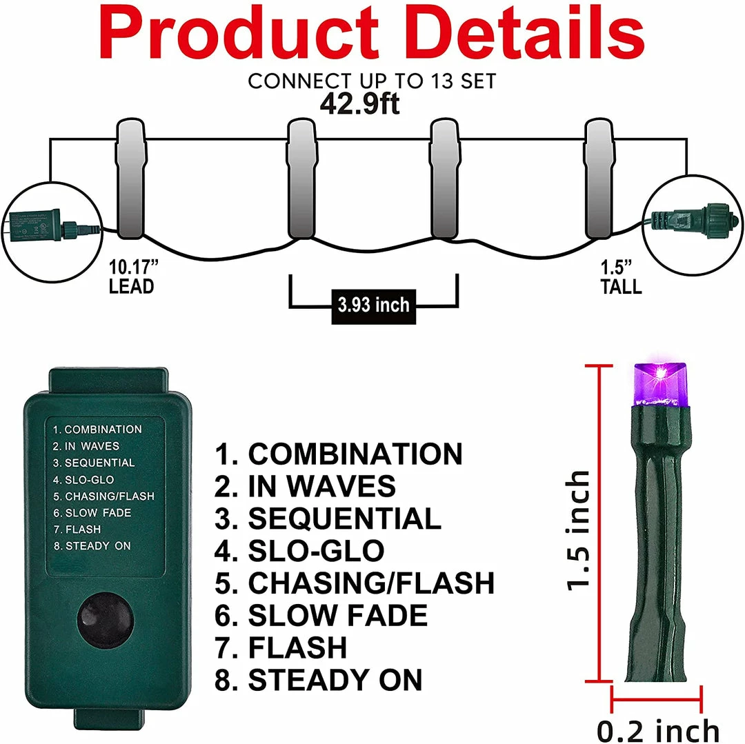 - Our Halloween lights include 100 count purple LED green wire string lights with 8 modes. Each set’s total length is 42.9 feet and it has 3.93 inches spacing. The bulb’s diameter is 5mm and height is 8mm.