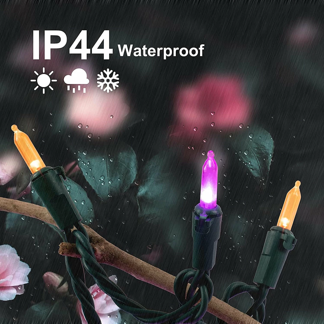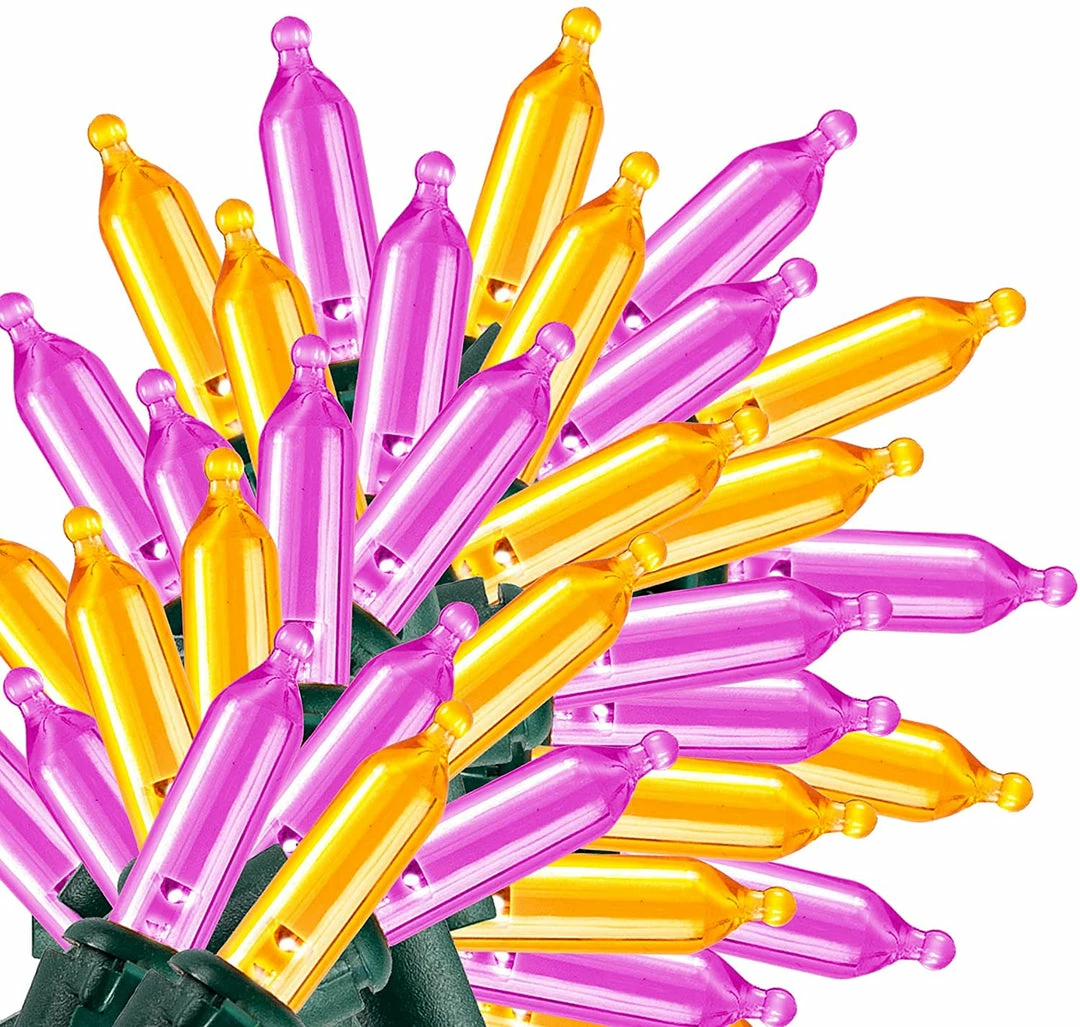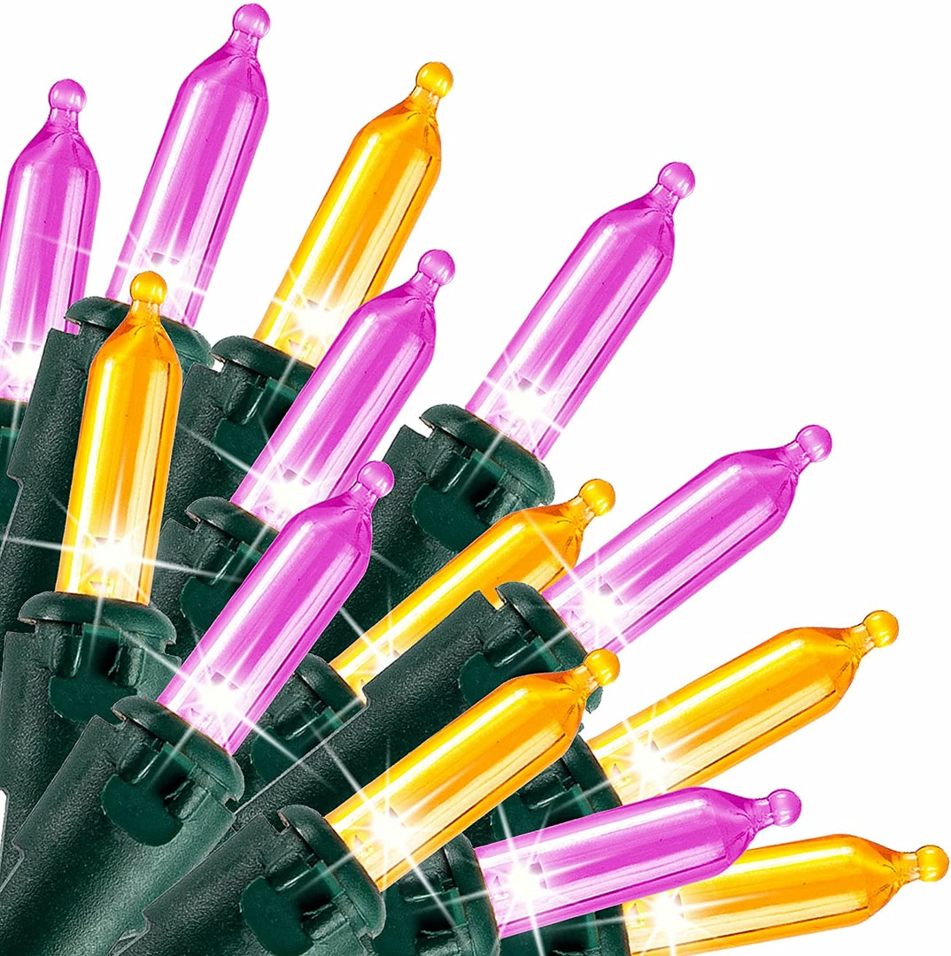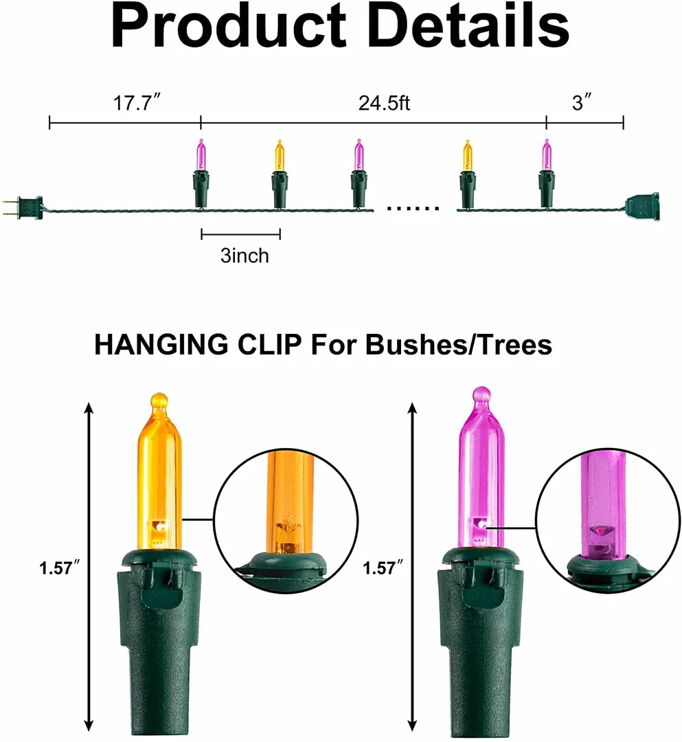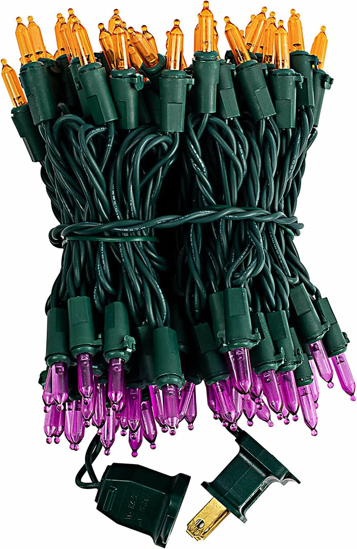 - Our Halloween lights set includes a set of 100 counts of always-on holiday purple and orange LED green wire string lights.Β