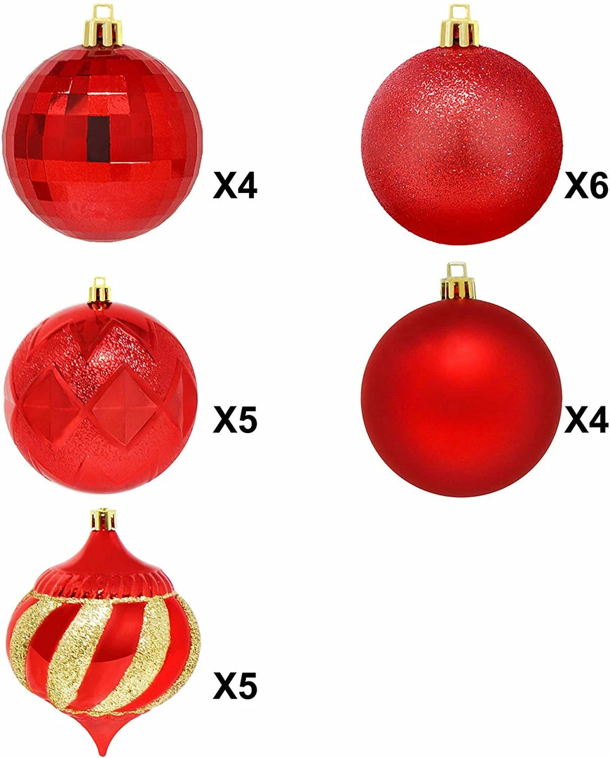 - SUPER VALUE PACK. Our Christmas Tree Ball Ornaments Set includes 6 Quilted Balls, 6 Stripes Balls, 6 Disco Balls, 6 Glitter Balls, 5 Matte Balls, 5 Shiny Balls.