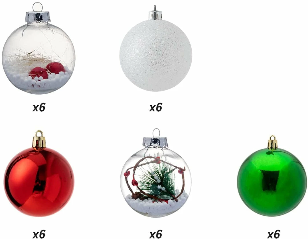 - Our fantastic Christmas decorations include 6 shiny balls, 6 glitter balls, 18 clear plastic balls. Each color is bright and beautiful and perfect for Christmas indoor and outdoor decorations!