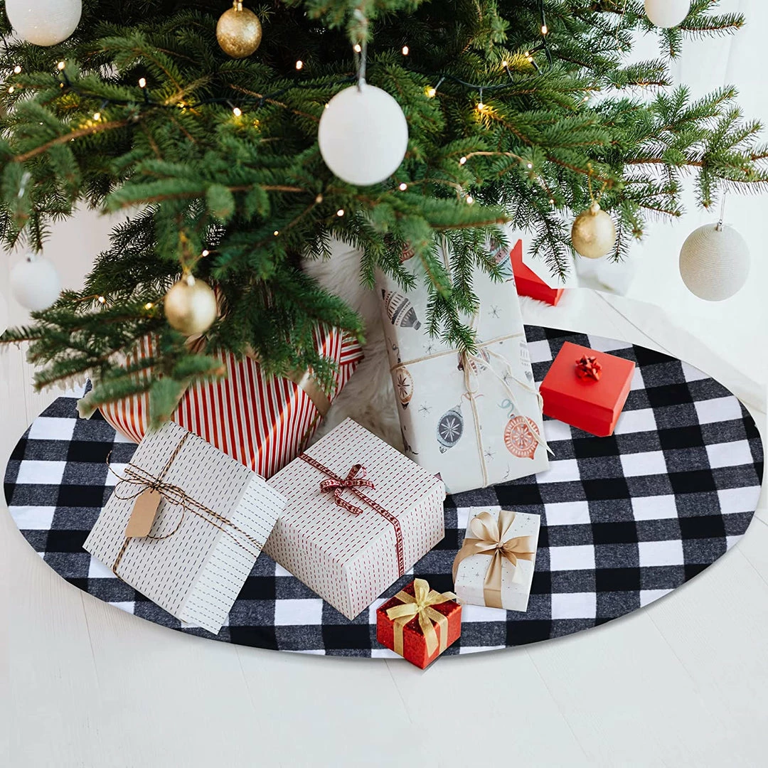 - Our Christmas tree ornament includes a 48″ thick plaid white buffalo check tree skirt.