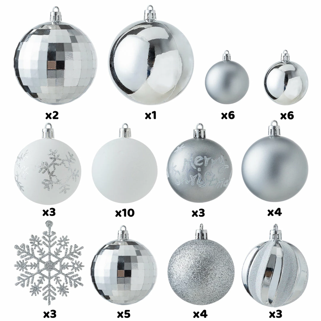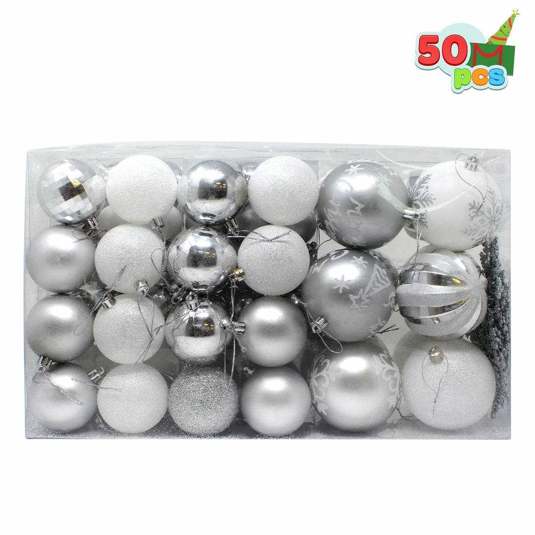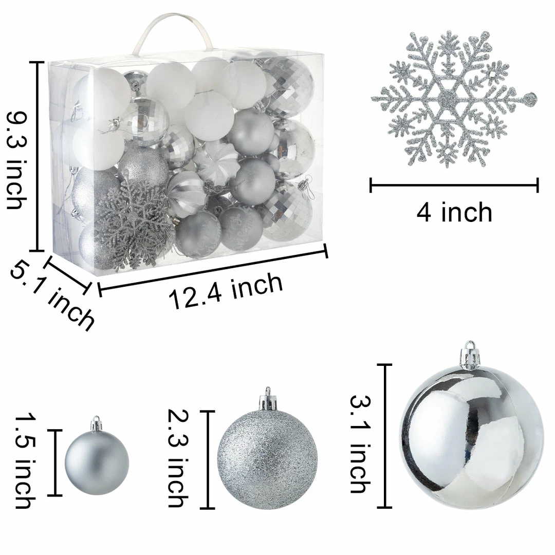 - Our fantastic Christmas decoration set includes 50 pcs assorted Christmas ball ornaments of 10 matte balls, 10 white balls, 7 shiny balls, 7 disco balls, 4 glitter balls, 3 swirl balls, 3 hexagram snowflake balls, 3 Christmas tree balls, 3 snowflakes. Perfect for indoor and outdoor decorations for this Christmas season. Measuring 1.57, 2.36, 3.15 inches.