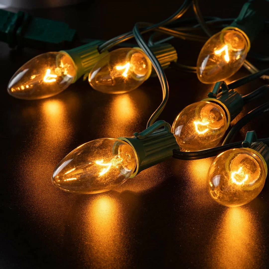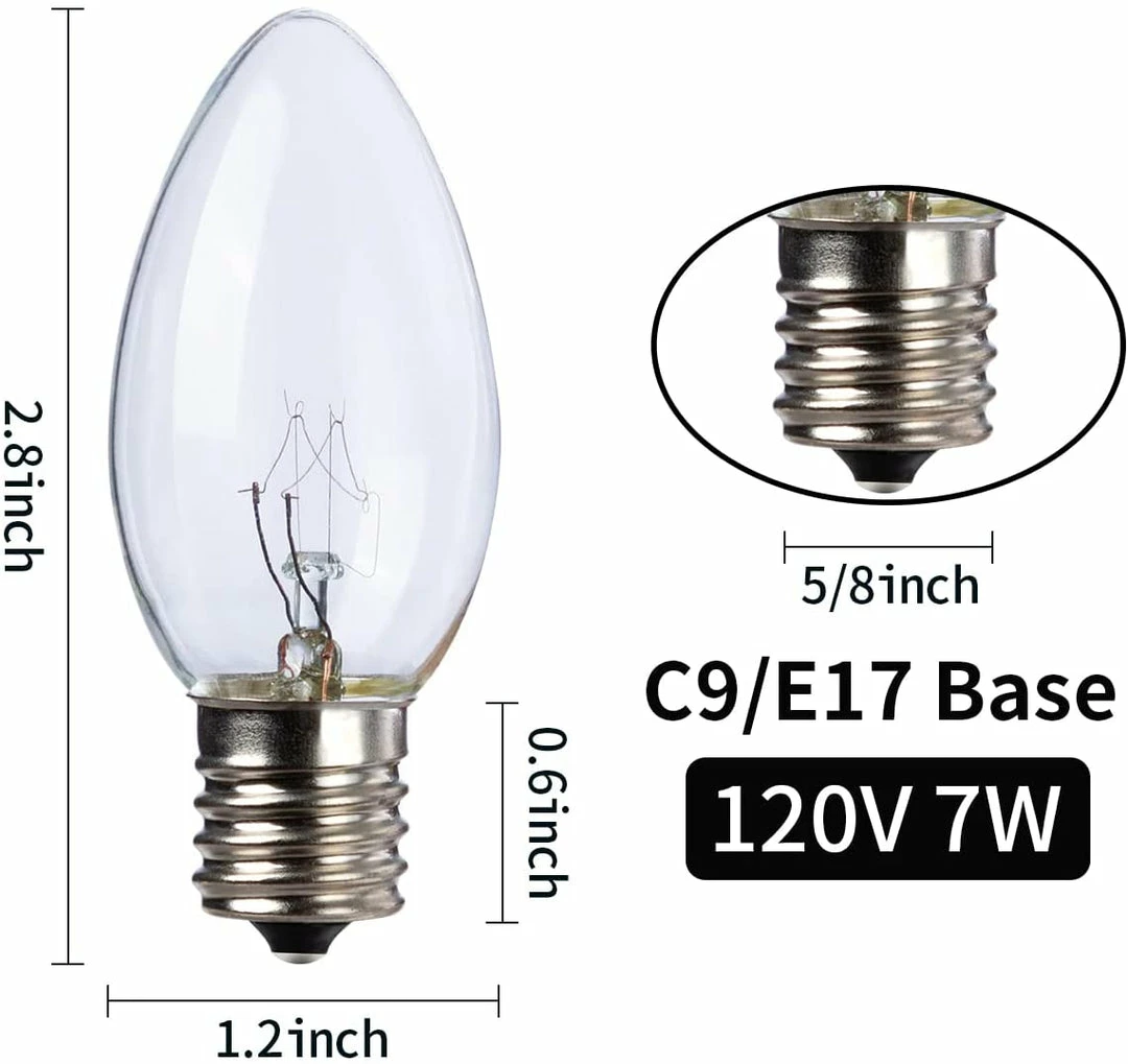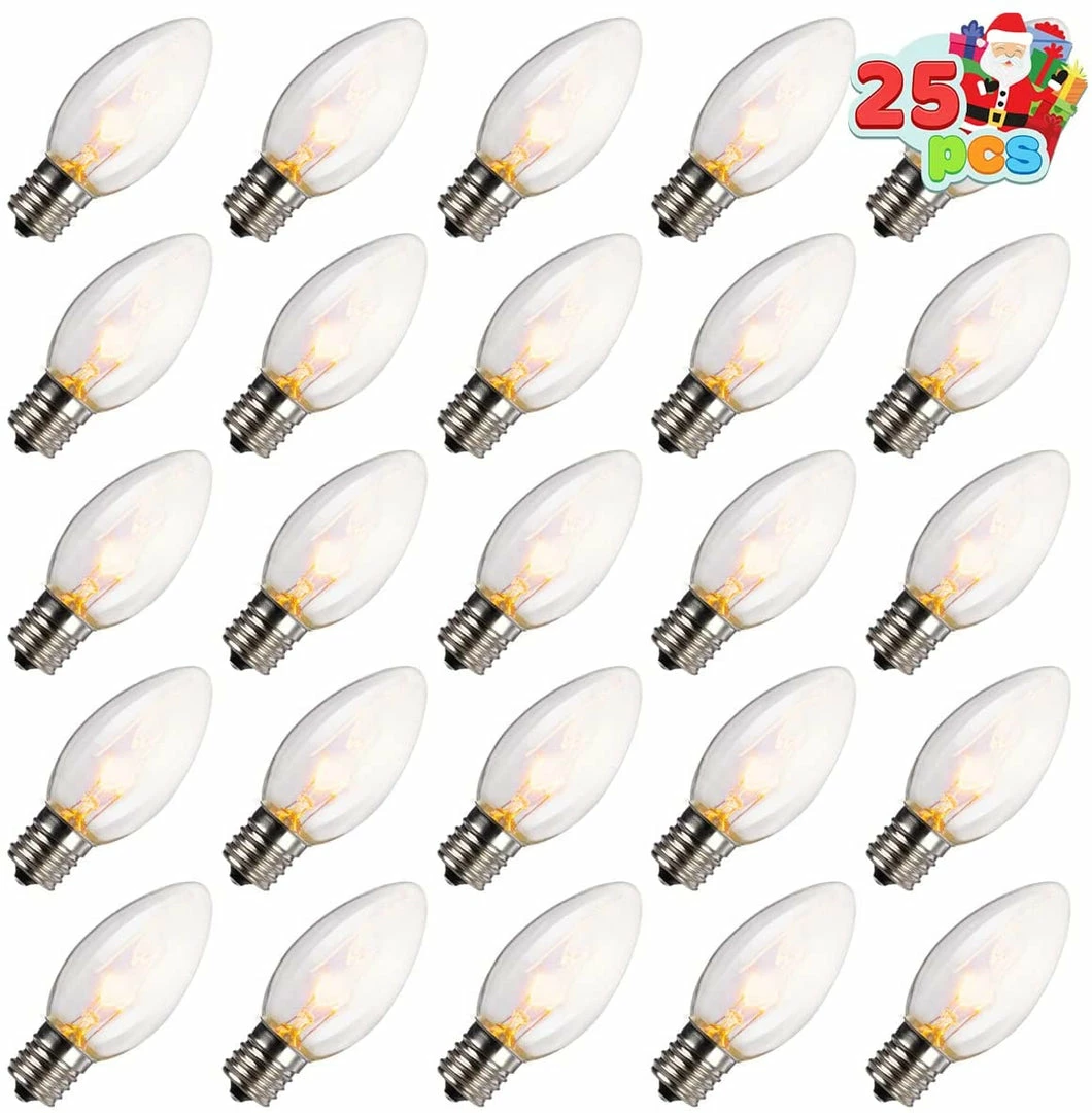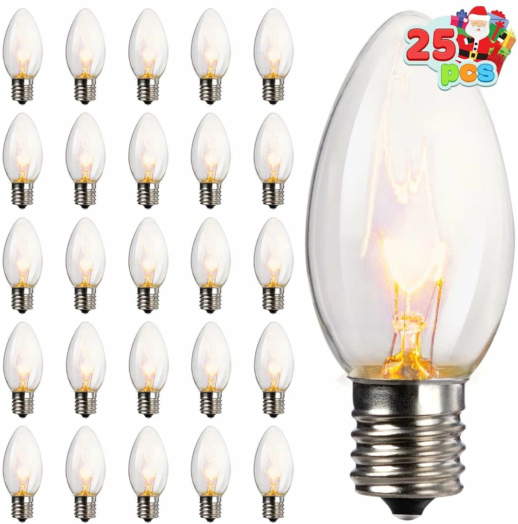 - OurΒ Christmas c9 light bulb set is bulk packed in a 25 piece box, clear replacement bulbs fits in c7/ e12 candelabra screw bases, 7 watt light bulbs glow a warm white, perfect for candle lamps, room, Christmas tree, patio, garden porch string lights. WillΒ light up your house with this clear replacement.