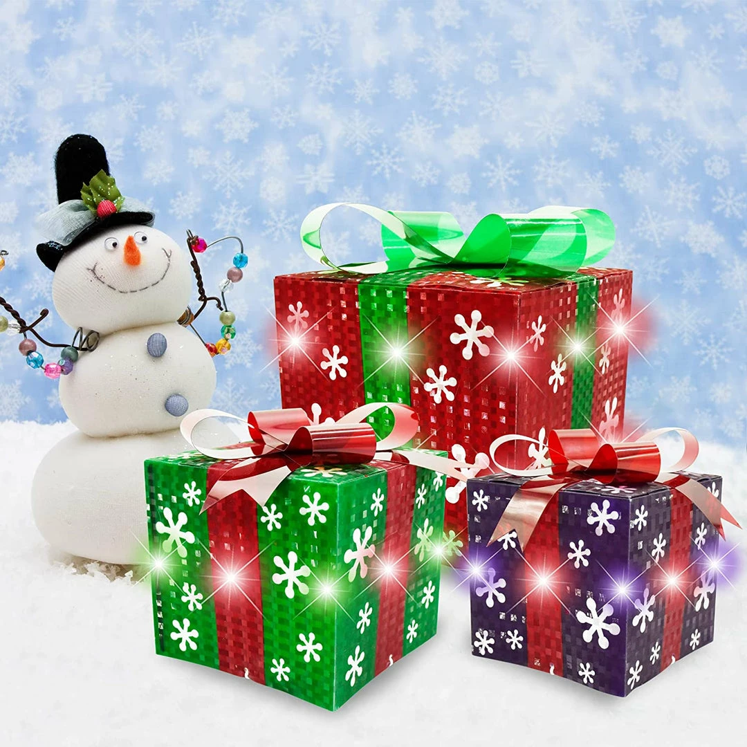 - PREMIUM QUALITY- JOYIN set of 3 Christmas gift boxes decorated with 50 warm white lights. Made with beautiful colored PVC. It adds a festival spirit to Christmas whether places on Christmas Tree Skirt or anywhere you can imagine.