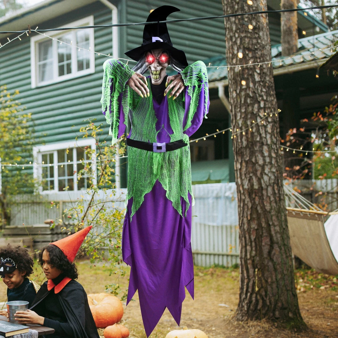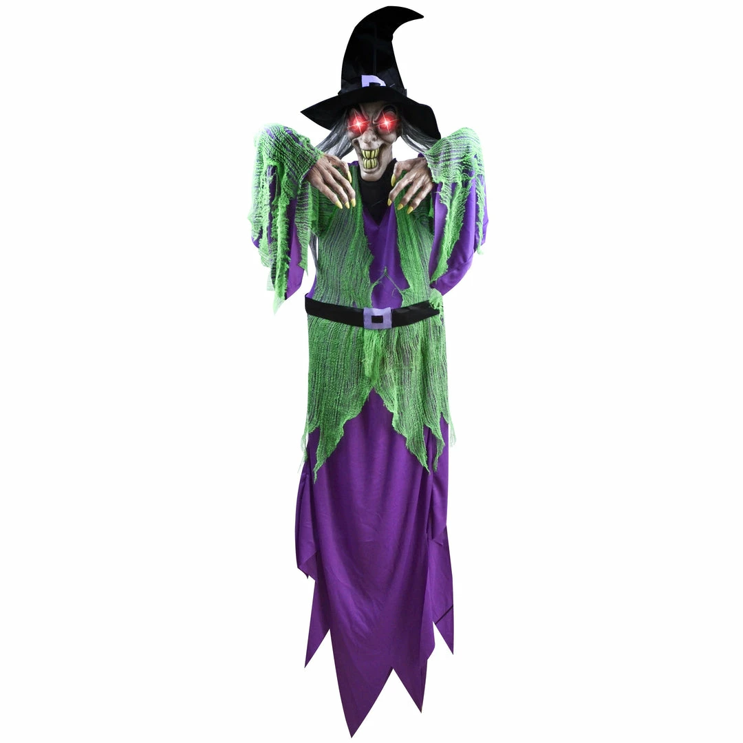- Easily create a scary atmosphere and make your home a place of horror for your guests with our Halloween hanging animated witch which has flashing eyes and spooky sounds.