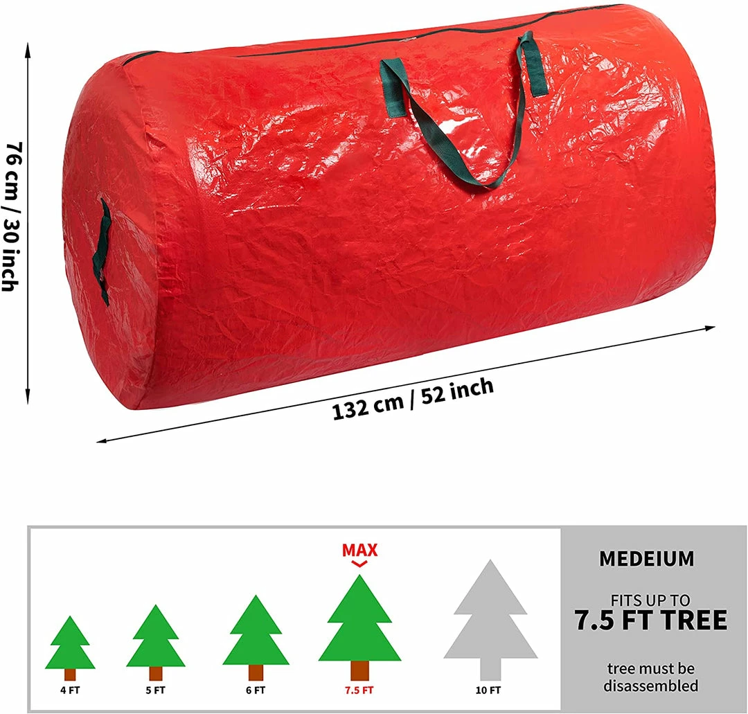 - This red waterproof Christmas tree storage bag is spacious with the size of 52″ in length and 30β in width. Suitable for 7.5 feet disassembled artificial Christmas tree.