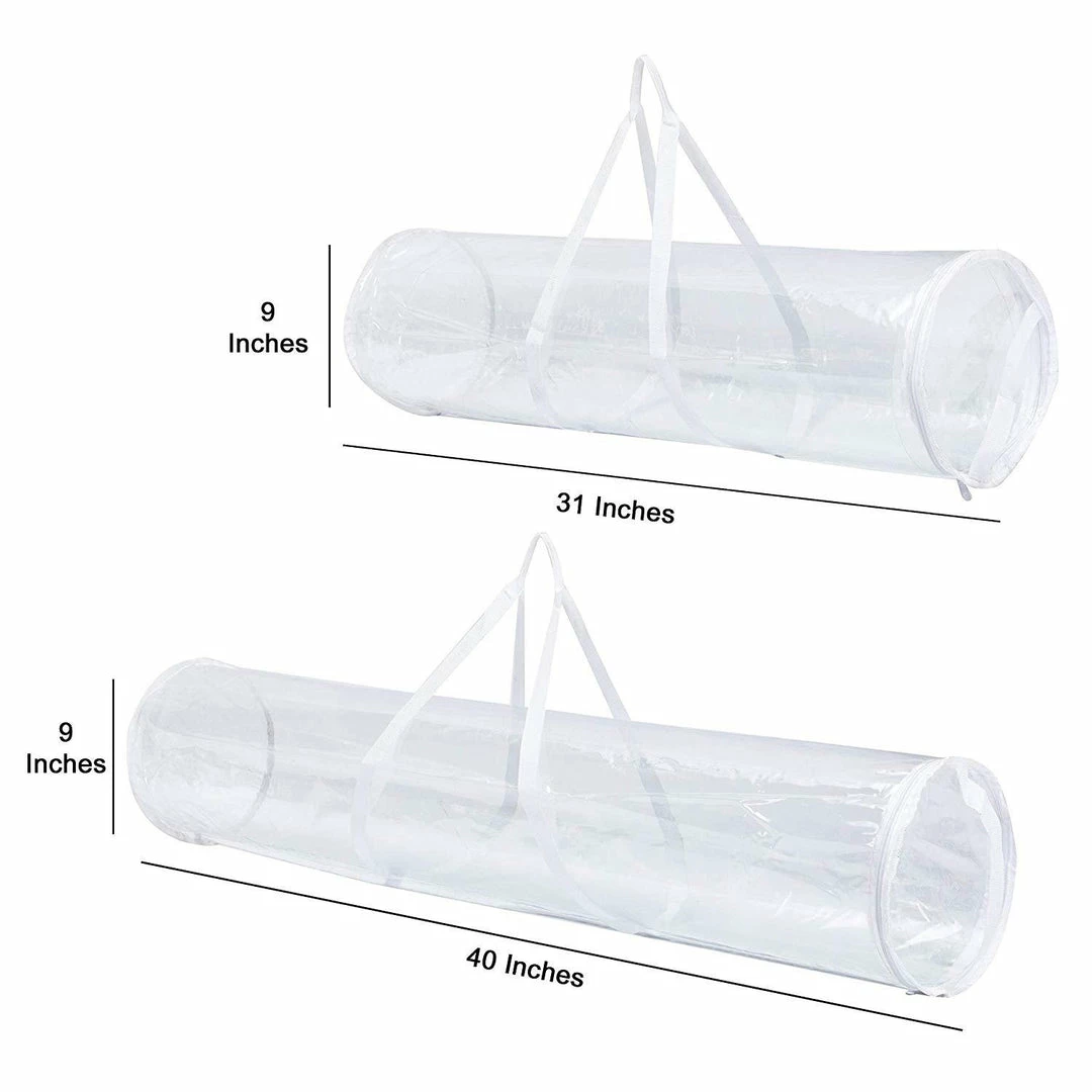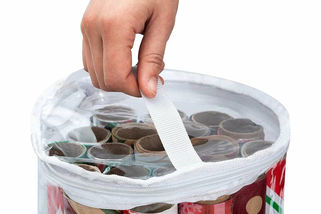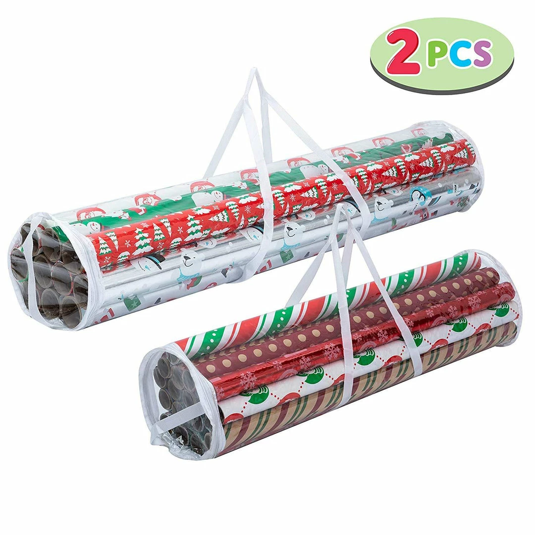 - Wrapping paper storage containers set: 2 joiedomi clear gift wrap storage organizer with different length(30.5” and 39.5”) helps you store and sort multiple rolls of wrapping paper. Each bag fits up to 20 rolls (1.5” thick)