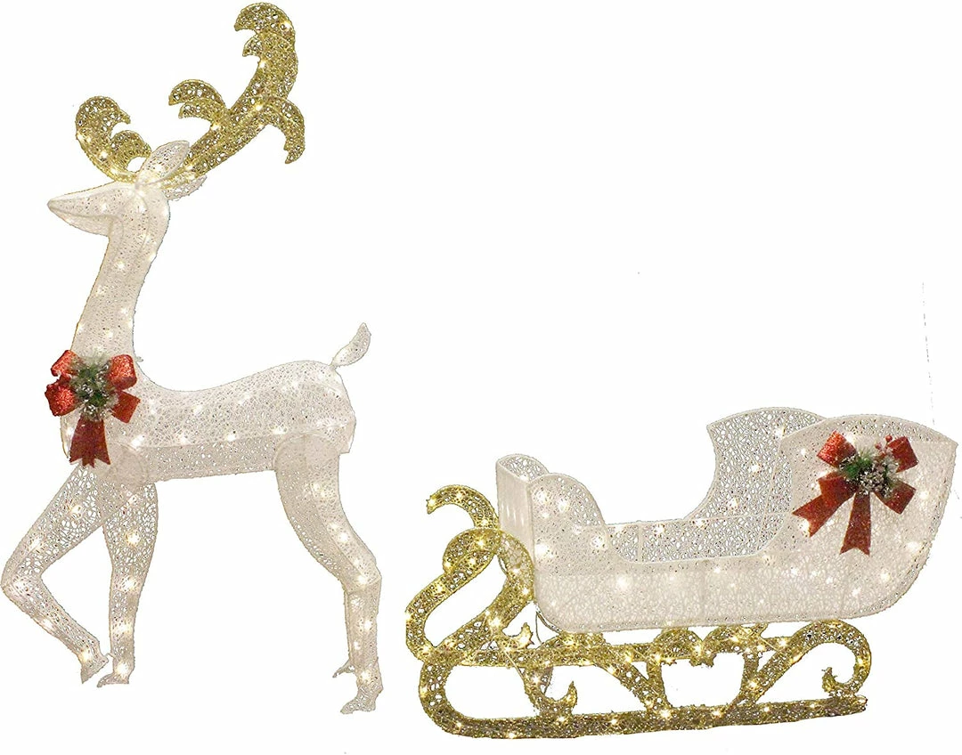 - SUPER VALUE PACK. Our 2 Packs Christmas LED Yard Lights includes a Reindeer and a Sleigh with 215 LED Warm White Lights in Clear Wire, 8 Metal Stakes, Zip Ties, and Screws. Made of Fabric Material. They are 5ft (Buck), and 3ft (Sleigh) Feet Tall.