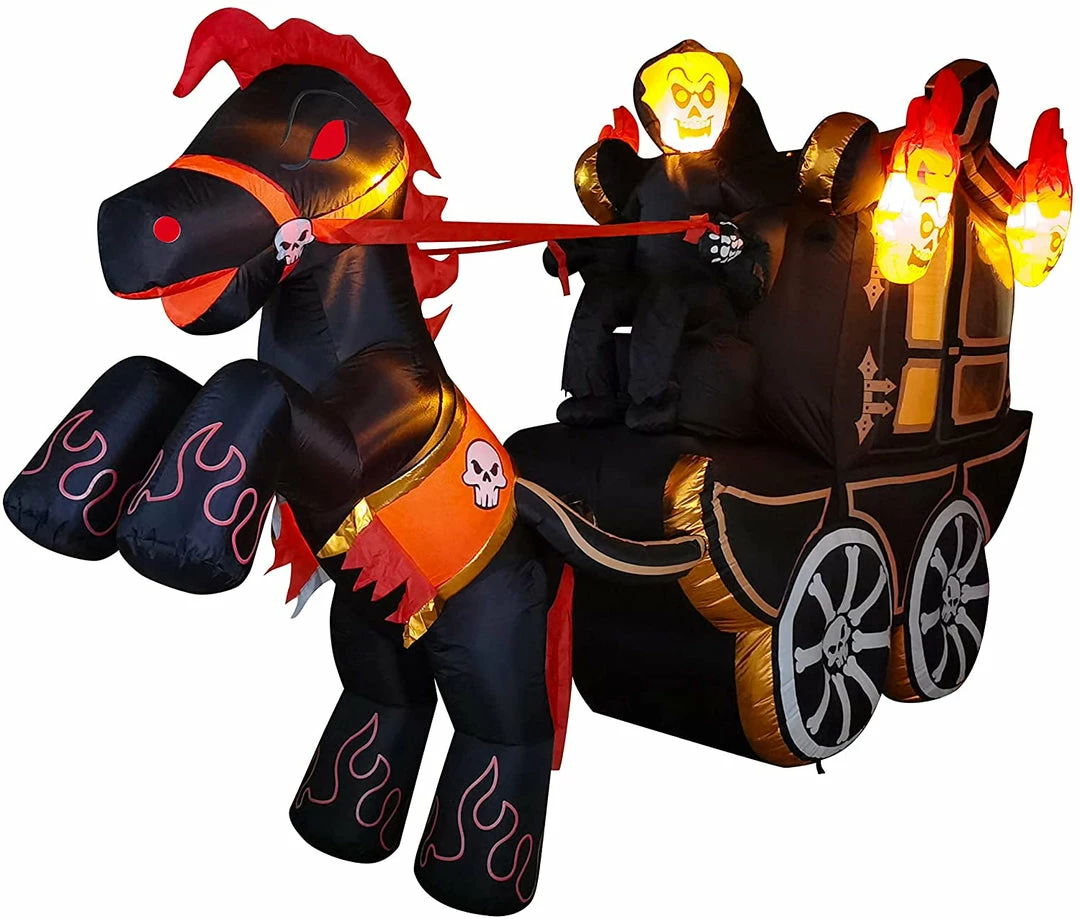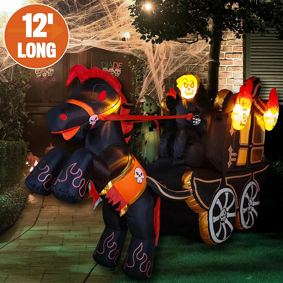 - 12 ft Long Carriage Halloween Inflatable with Hell Flame comes with extended cords, ground stakes, fastened ropes, built-in sandbags, and a plug with UL certification.