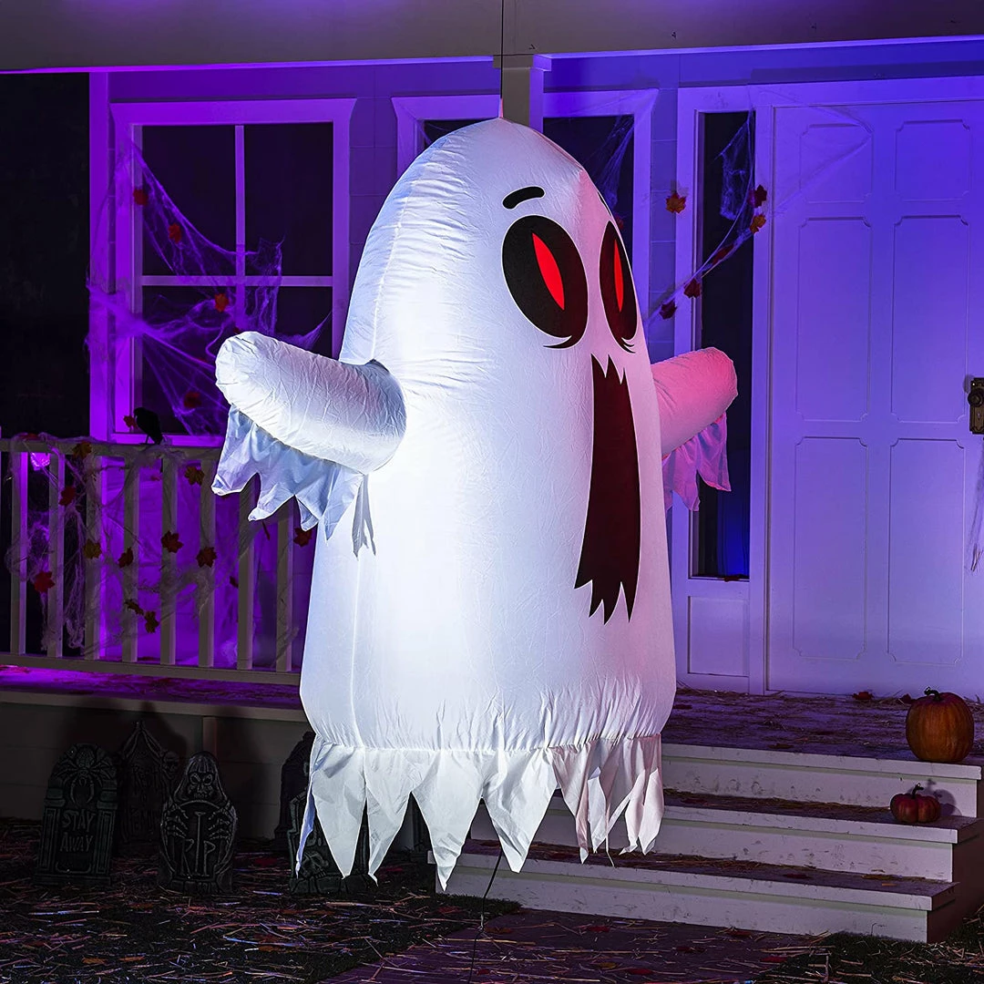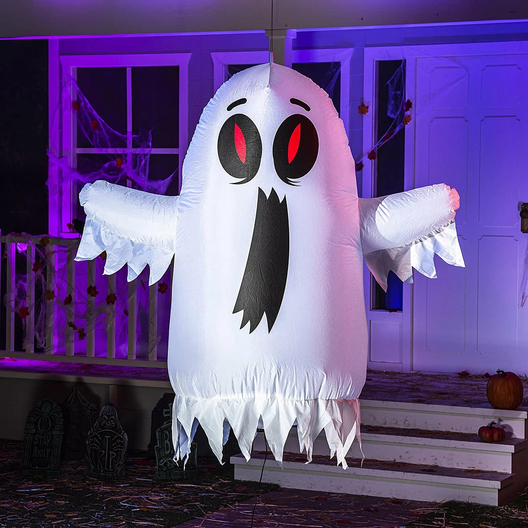 - 4 feet tall thrilling Halloween floating ghost inflatable with LED eyes comes with fastened ropes, built-in sandbags.