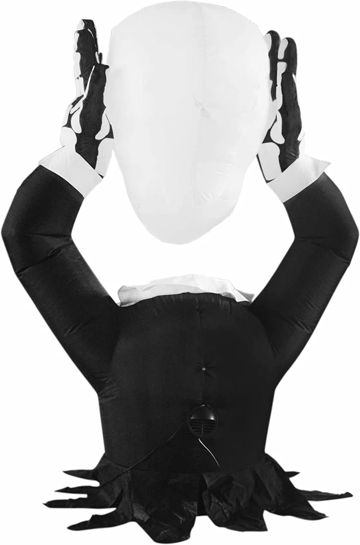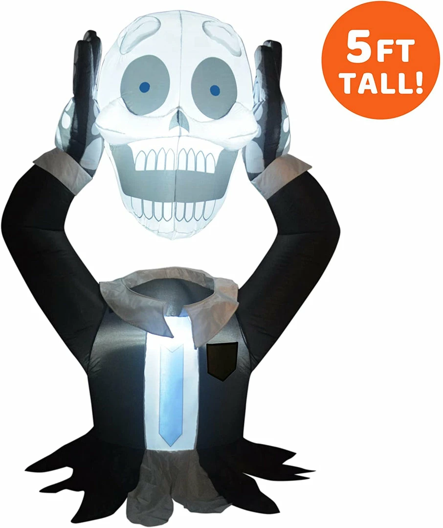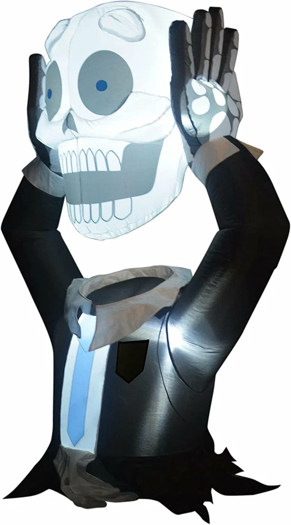- 5 feet long groundbreaker skeleton holding head Halloween inflatable comes with extended cords, ground stakes, fastened ropes, built-in sandbags, and a plug with UL certification.