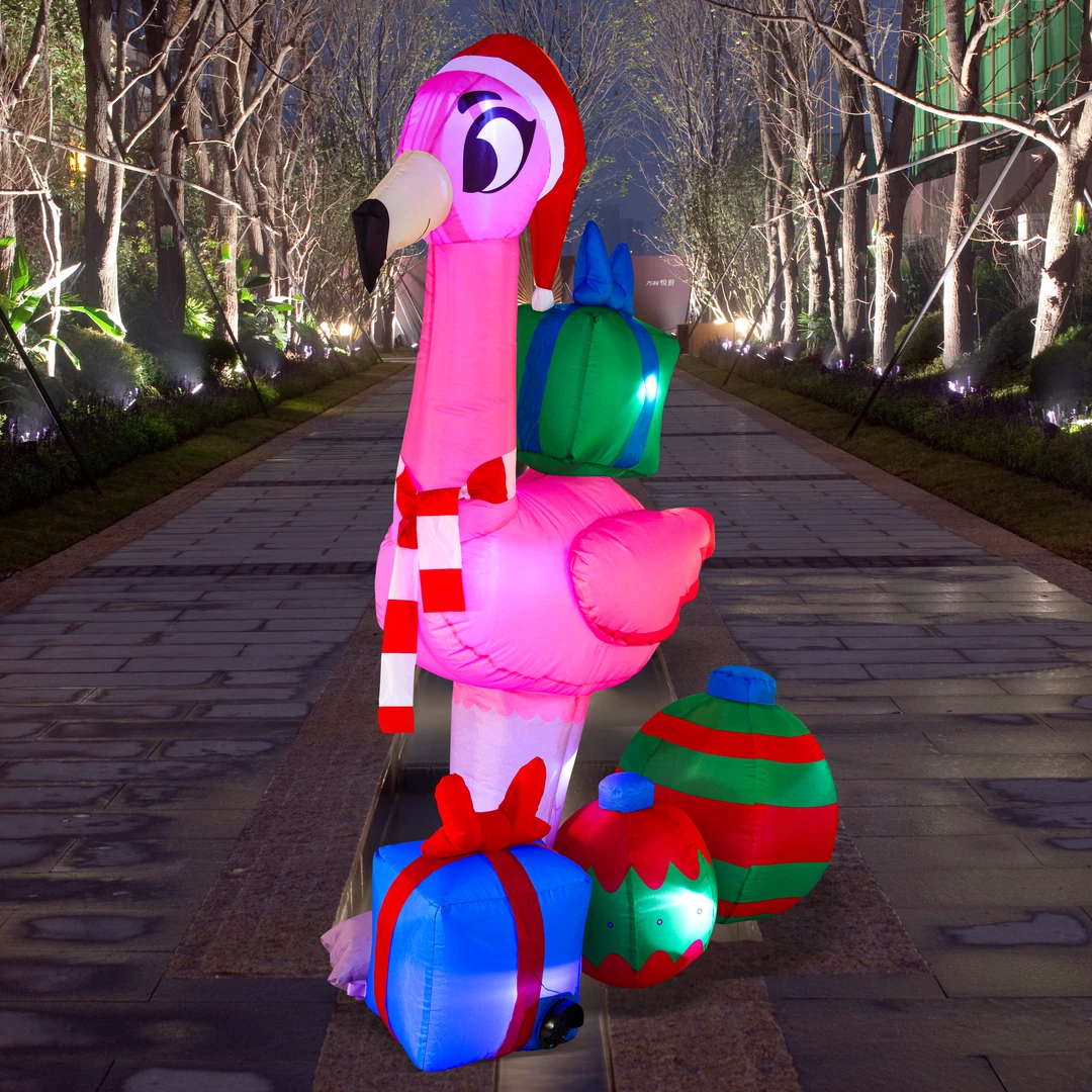- 6ft Christmas Flamingo with Gift Boxes comes with an extended cord, ground stakes, fastened ropes, built-in sandbags, and a plug with UL certification.