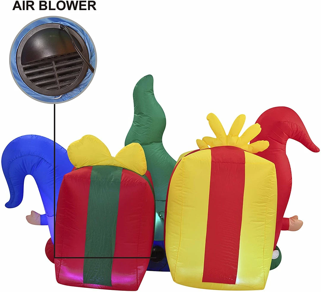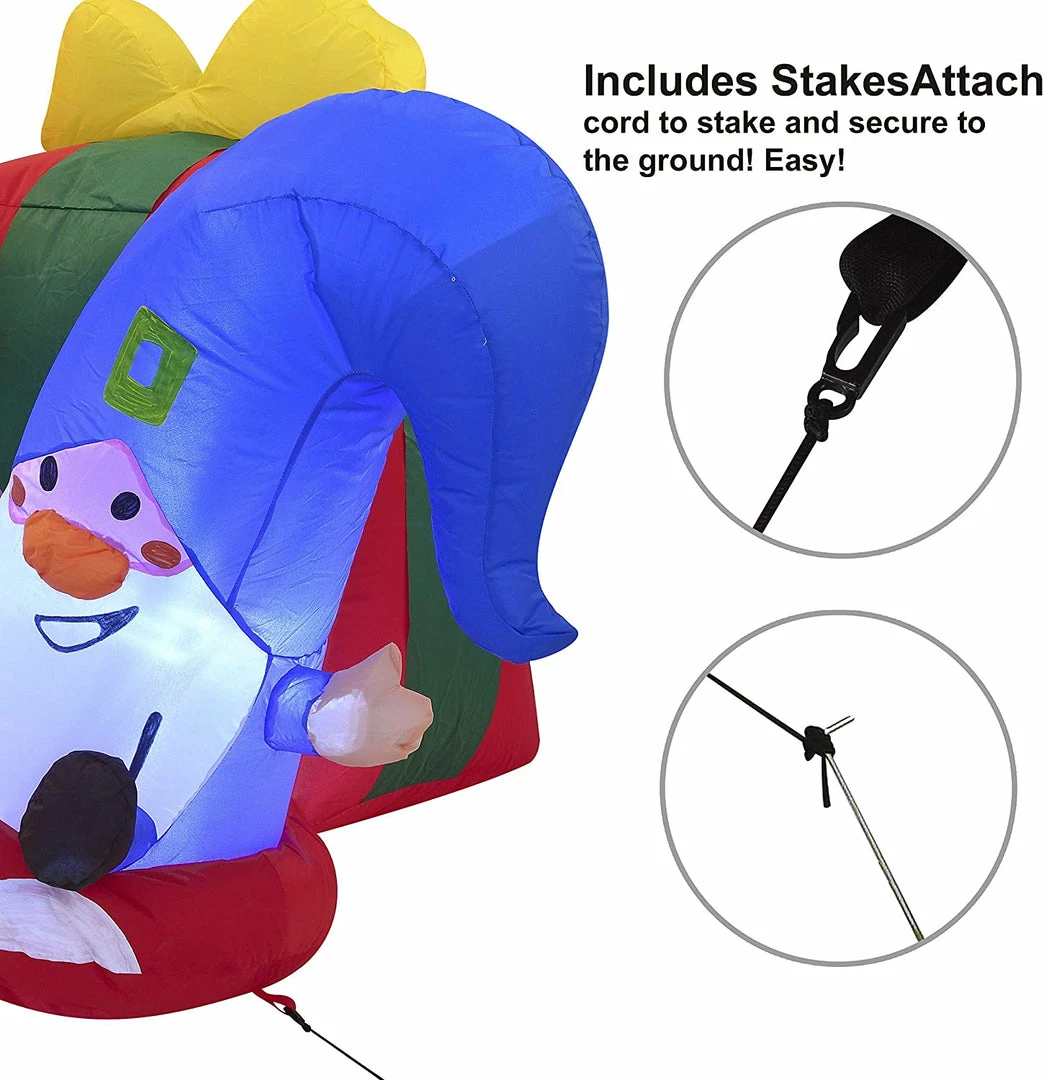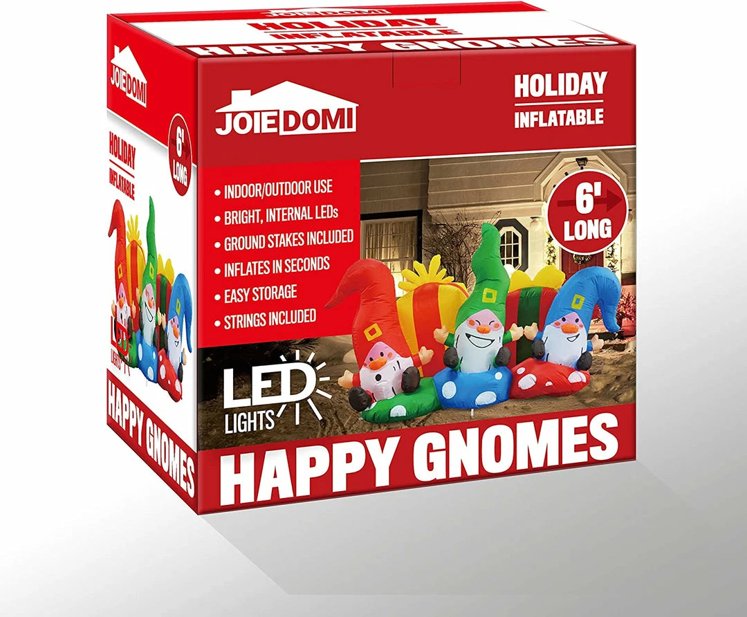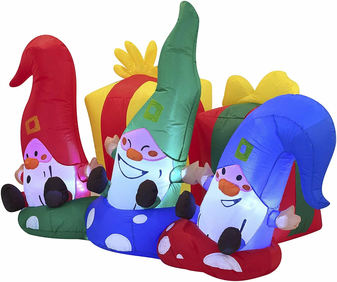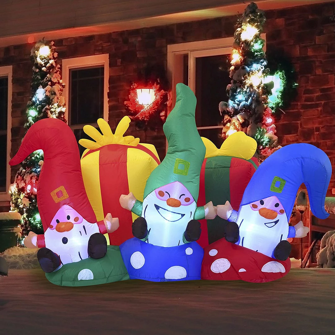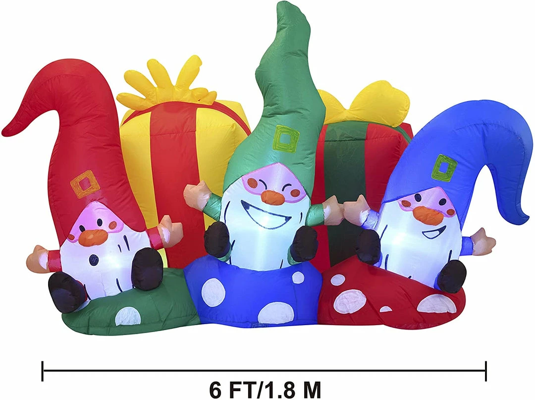 - 6ft Long Christmas Three Happy Gnomes Inflatable comes with an extended cord, ground stakes, fastened ropes, built-in sandbags, and a plug with UL certification.